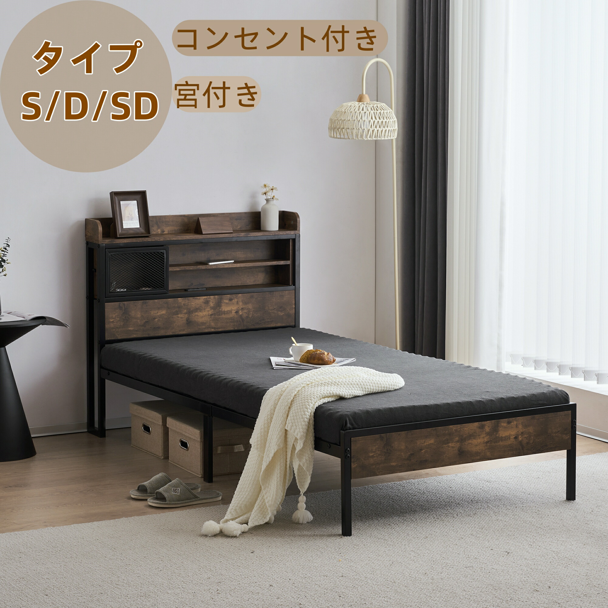 ベッドフレーム シングル セミダブル ダブル 耐荷重120kg コンセント付き 宮付き パイプ+木 パイプベッド アイアンベッド 収納ボックス 下収納 インダストリアル