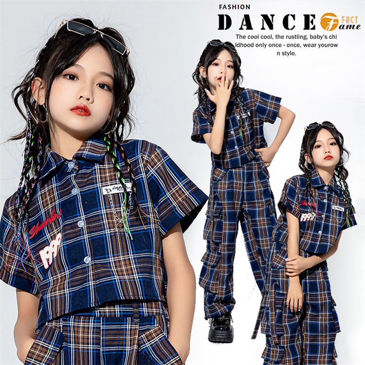 ヒップホップ ダンス衣装 キッズ チェック柄 シャツ 半袖 パンツ 男の子 セットアップ へそ出し 女の子 HIPHOP ステージ衣装 応援団 ジャズ ダンスウェア 練習着 団体服 チアガール 演出服