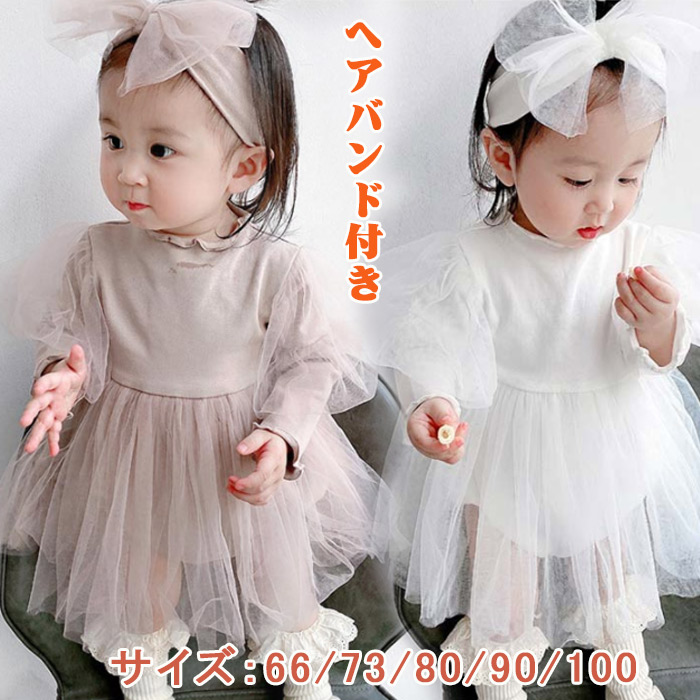 ベビー ワンピース ロンパース ベビードレス 女の子 半袖 長袖 チュール ヘアバンド付き ベビー服 秋 白 セレモニードレス 新生児 フォーマル