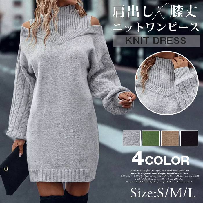ニットワンピース 肩出しワンピース ニット ワンピース ミニ 肩出し 肩だし チュニック タイト 長袖 大人 セクシー 秋冬 無地 韓国風 ミディア丈 きれいめ 体型カバー 着痩 膝丈ワンピース