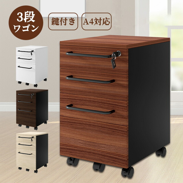 デスクワゴン 完成品 3段 鍵付き サイドワゴン 大容量 キャスター付き ワゴン A4 ファイル オフィス 木製 収納 キャビネット 脇机 引き出し 事務机