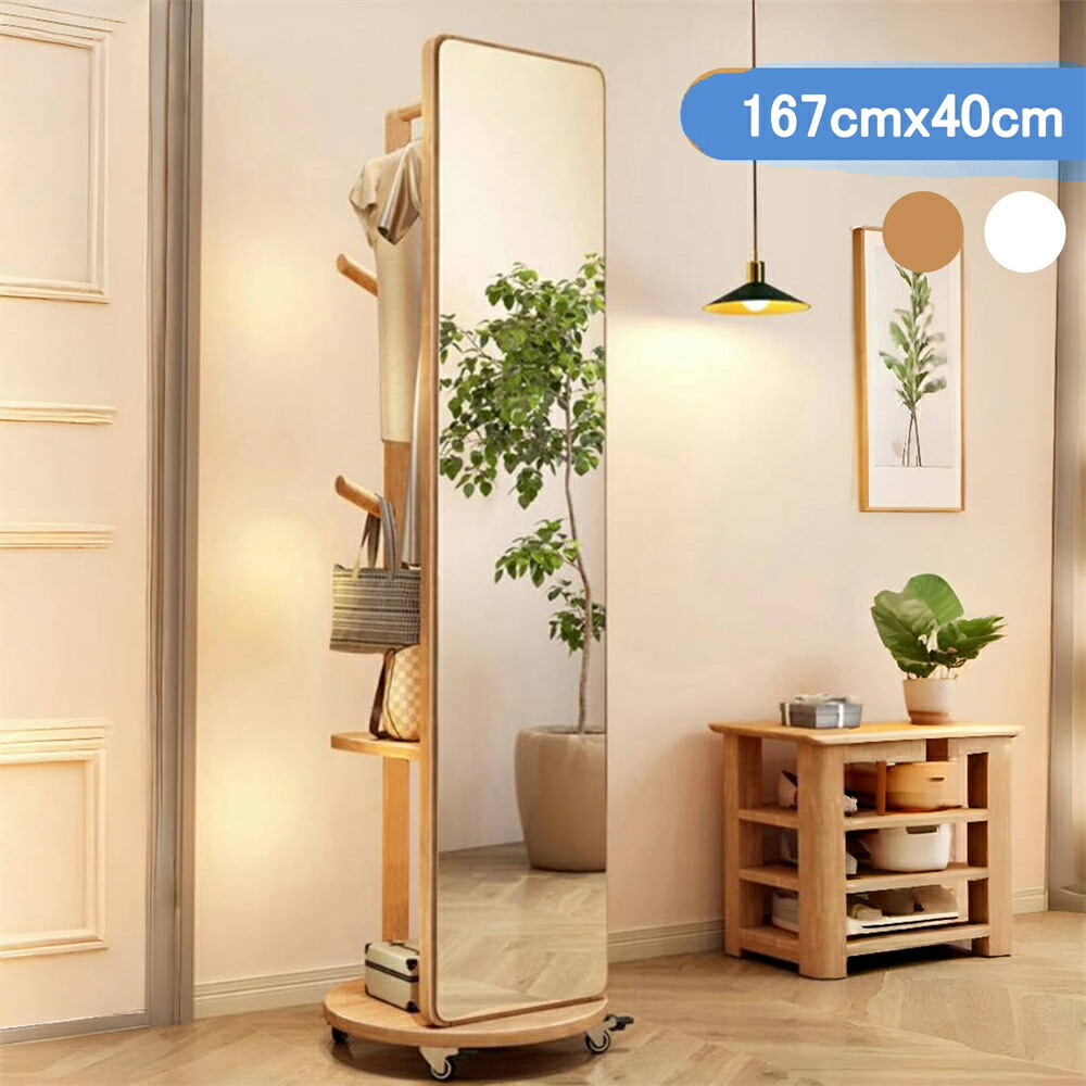 全身鏡 スタンドミラー ハンガーフック イレギュラ ハンガーフック付き鏡 ハンガー 360°回転可能なキャスター付き 北欧 収納付き 衣類収納 隙間収納 玄関 飛散防止加工 ホワイト167* リビング
