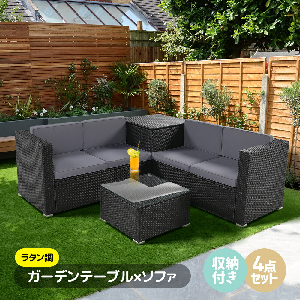 ラタン調 ガーデンソファー テーブルセット 4人掛け ガーデンファニチャー 収納付き クッション付き 4点 ガーデンテーブル ガーデンチェアー テーブル 家 カフェ ベランダ 屋外家具 楽組