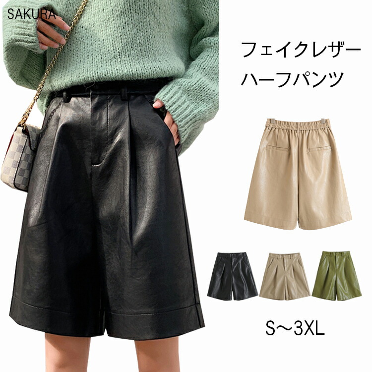 エコレザーショートパンツ ショートパンツ レディース ボトムス ハーフパンツ レザーパンツ タックパンツ 春 春夏 フェイクレザー 合皮 ウエストゴム 黒 グリーン 緑 ブラッ カーキ