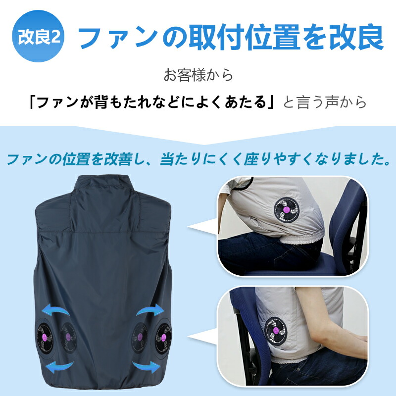 猛暑の夏に、工場や屋外作業などエアコンの使用できない環境で作業する人たちへの高温対策のクールファンベストです。高温の環境でも楽に仕事して作業効率を上げることができるファン付きベスト。外気を取り入れ、汗の蒸発を促して、体温が有効的に下がる。早くて汗を蒸発させるので大量の汗をかく不快感が改善できます。また、汗がすぐに蒸発するので、汗臭が減り、あせもなど、汗による皮膚病になりにくくなります。皮膚をさっぱりにして、体を守ってくれます。