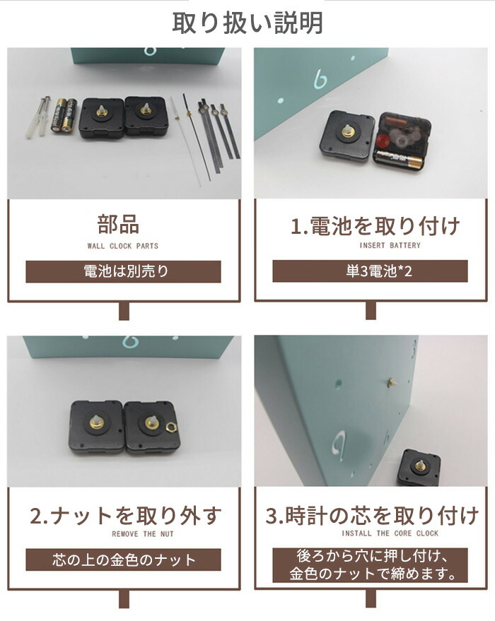 最初にバッテリーを取り付けます(プラス極とマイナス極に注意してください)。 次に、ナットを取り外し、時計のムーブメントの金色のナットを取り外します。 次に、時計のムーブメントを裏側から小さな穴に押し込み、金色のナットで締めます。 最後に時針、分針、秒針を取り付けて時刻を調整します。