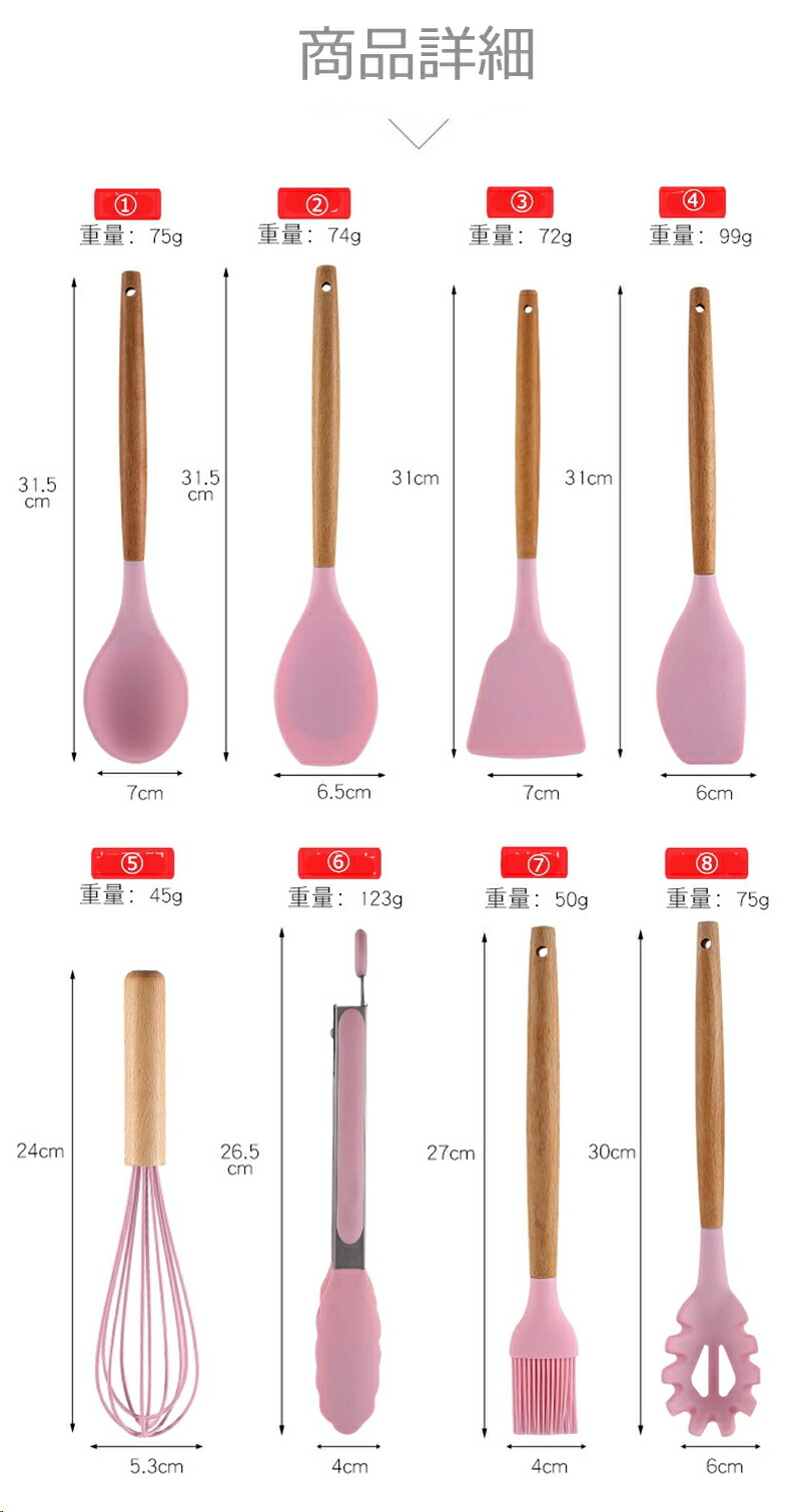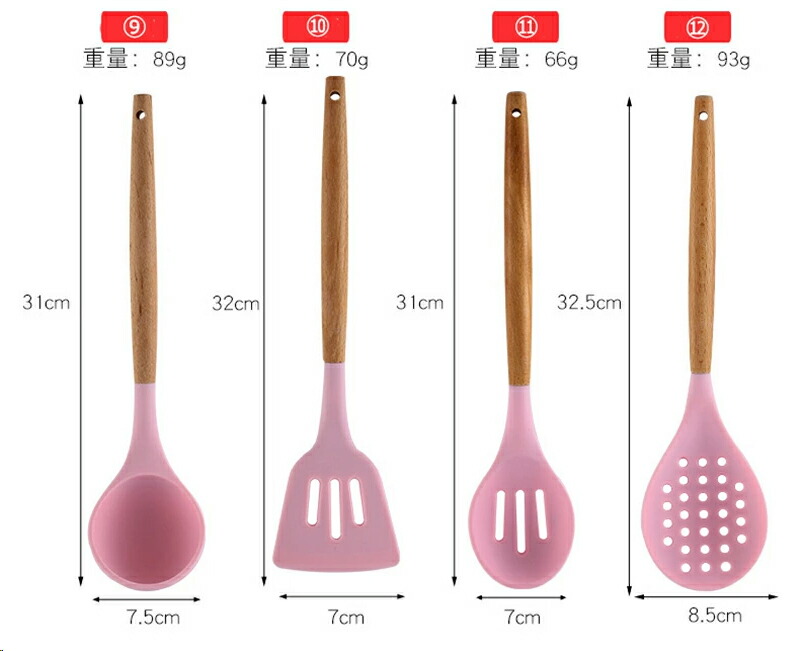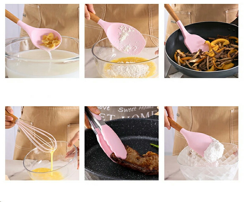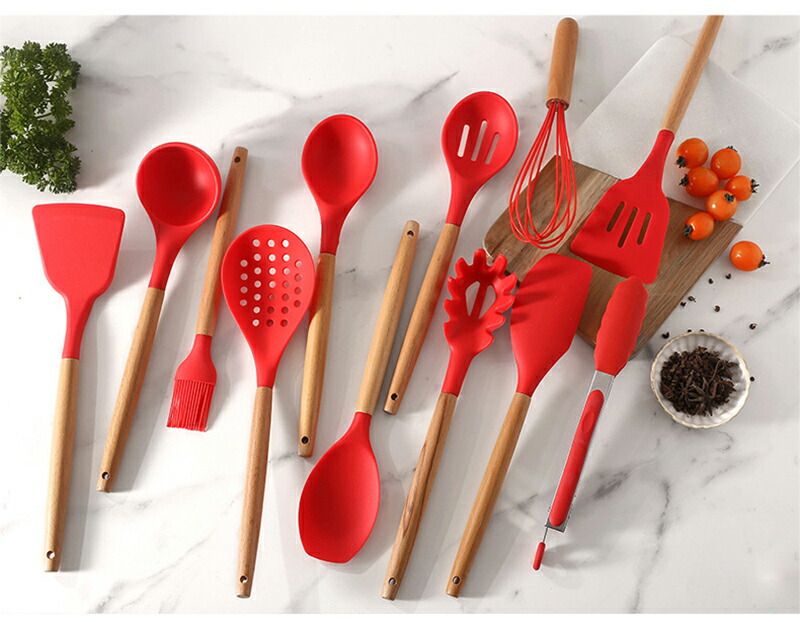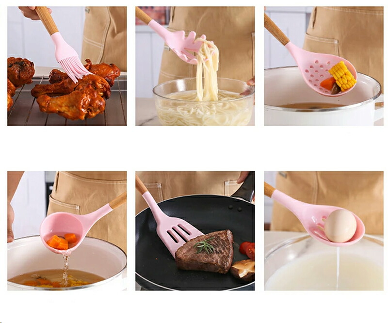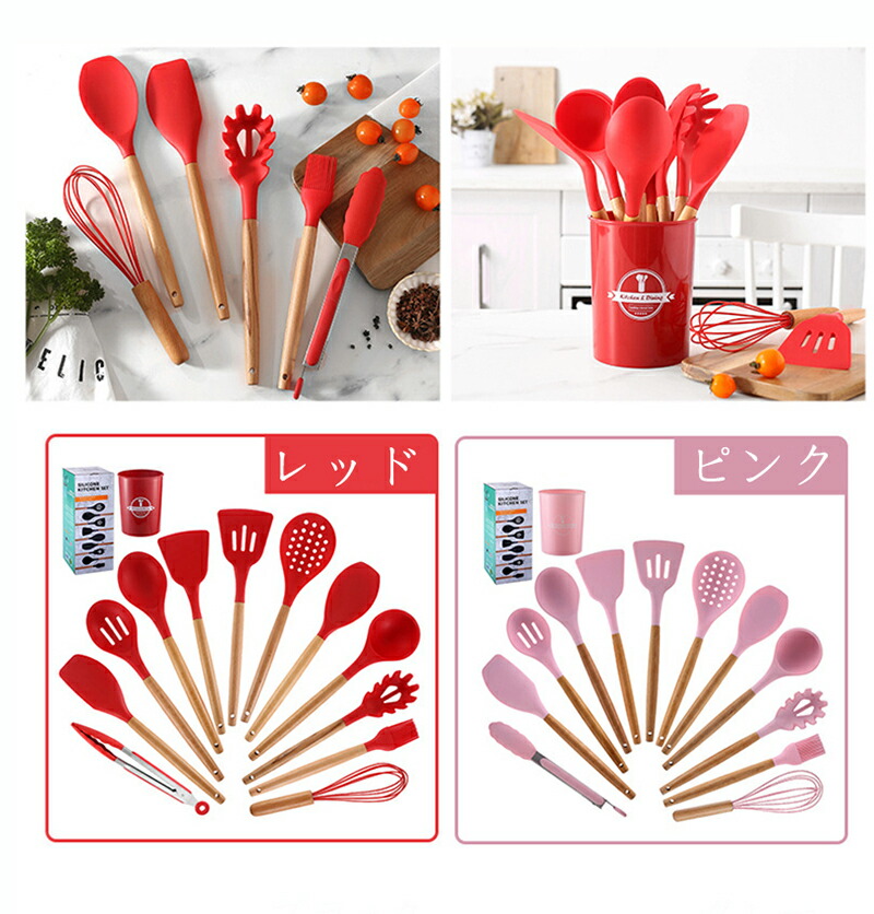 【安全性】人体に有害な化学物質BPA(ビスフェノールA)を含まないシリコン素材を使用し、LFGB、SGSとアメリカ食品医薬局 (FDA)のテストに合格したキッチンツールセット。調理器具ツールは木製のハンドルを採用し、熱の伝導は容易ではないです。シリコンの柔軟性だけでなくしっかりコシもあって、剛柔バランスの良い代物です。