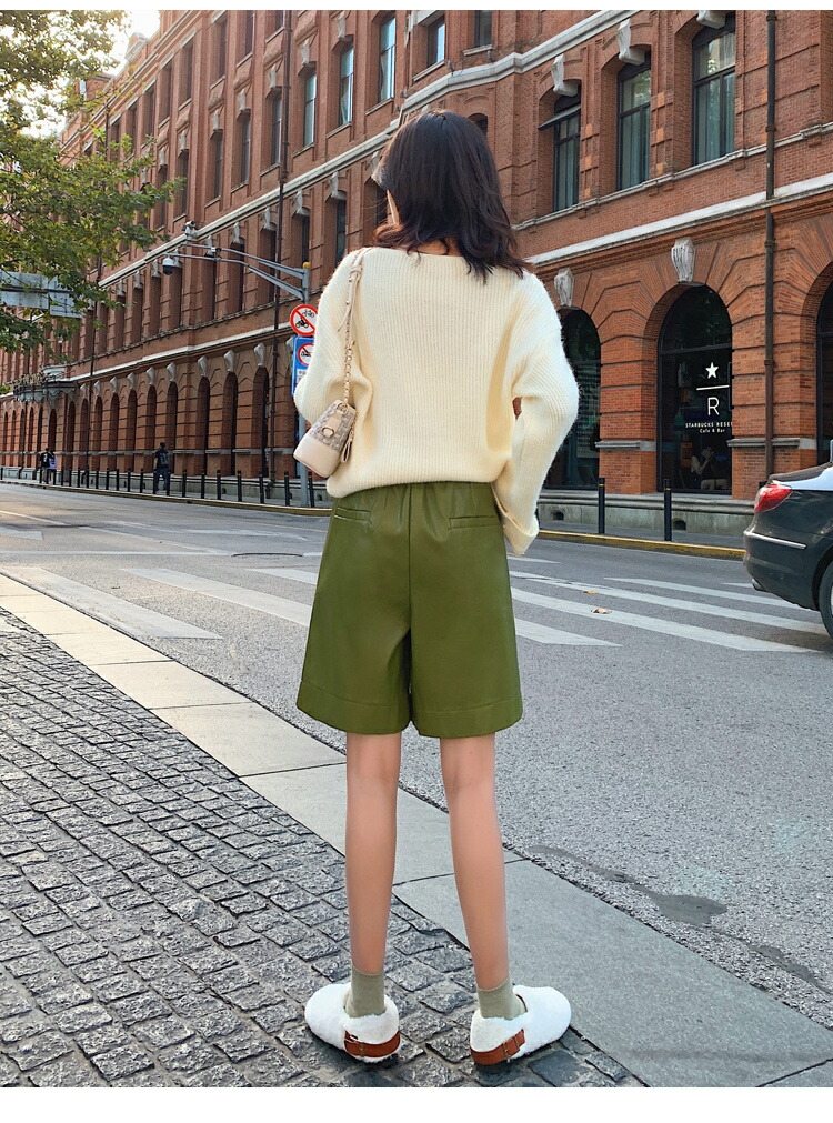 エコレザーショートパンツ ショートパンツ レディース ボトムス ハーフパンツ レザーパンツ タックパンツ 春 春夏 フェイクレザー 合皮 ウエストゴム 黒 グリーン 緑 ブラッ カーキ