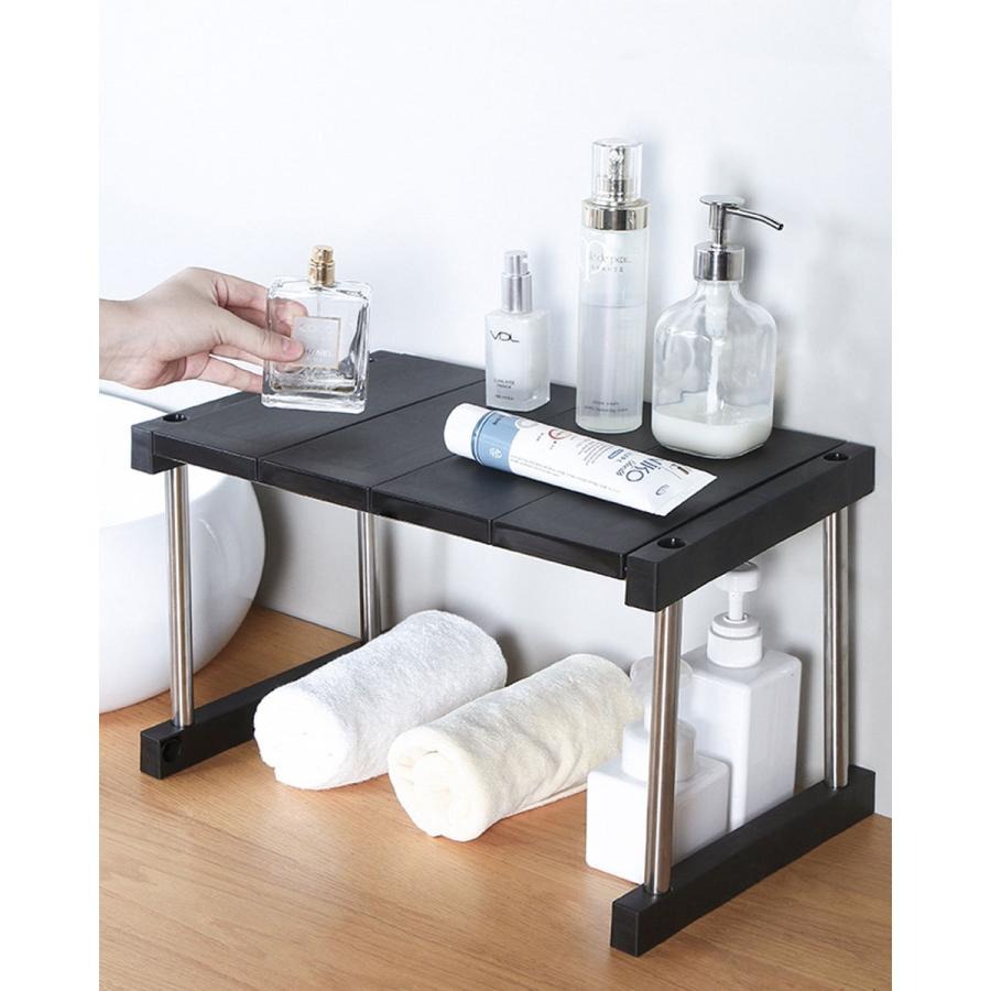 キッチンや洗面所、化粧台などの卓上はもちろん、リビングや廊下、玄関などの床上のスペースを有効活用して、小物を収納できるラックです。サイズが合えば、シンク下のスペースも整理整頓できるラックです。
