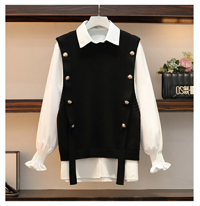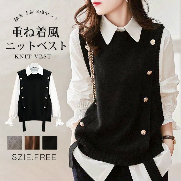 重ね着風 2点セット ニットベスト シ トップス ベスト 豊富な品揃え ブラック グレー コーヒー色