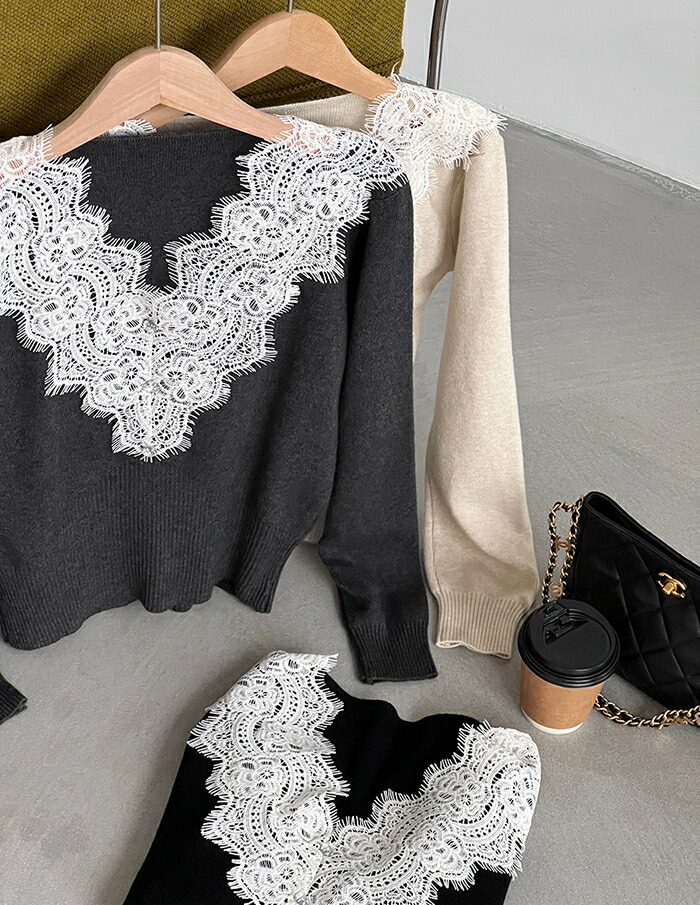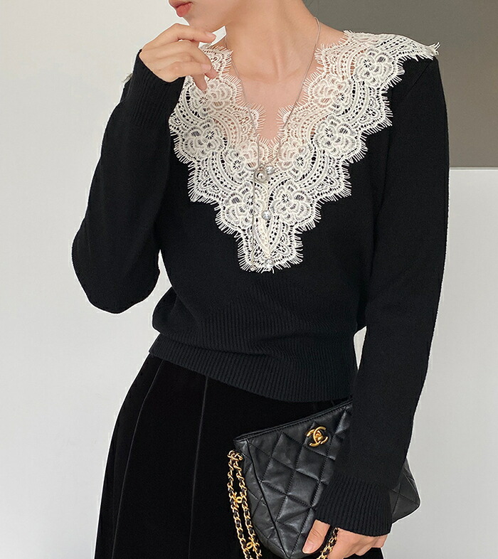 ニットセーター レディース Vネック 襟レースデザイン 花柄 きれいめ 上品 ニット ニットインナー トップス 長袖 セーター 長袖セーター プルオーバー ニットソー 秋 冬 ショート インナー