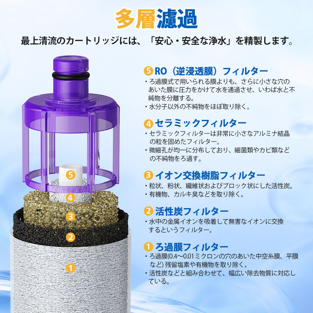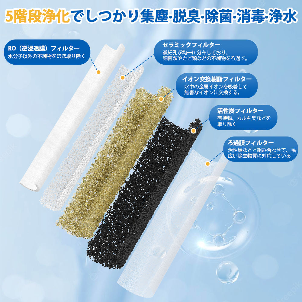 【5階段浄水性能アップ】17+4項目の浄水能力をクリア。水道水に含まれる残留塩素はもちろん、水に溶け込んだ有機化合物・農薬・鉛、不純物を除去した、「安心・安全な浄水」を精製します。活性炭フィルターは有機物、カルキ臭などを取り除きます。ろ過膜フィルターは活性炭などと組み合わせて、幅広い除去物質に対応しています。RO(逆浸透膜)フィルターは水分子以外の不純物をほぼ取り除きます。セラミックフィルターは微細孔が均一に分布しており、細菌類やカビ類などの不純物をろ過します。イオン交換樹脂フィルターは水中の金属イオンを吸着して無害なイオンに交換します。不純物を除去した水は健康なカラダにピッタリです。