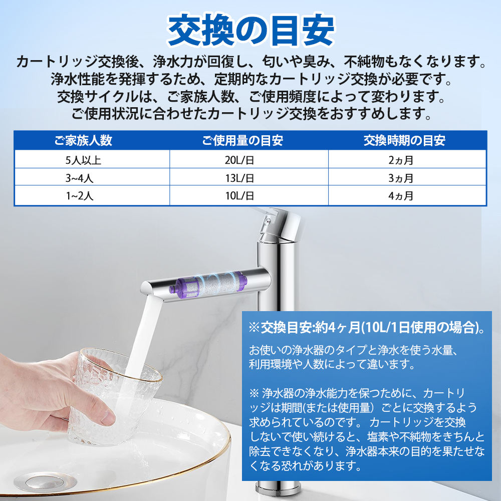 【経済的&エコ】カートリッジ1個で水1200リットルろ過可能。1日10L使用した場合、カートリッジ交換時期の目安は約4ヶ月となります。浄水器の浄水能力を保つために、カートリッジは期間(または使用量)ごとに交換するよう求められているのです。 カートリッジを交換しないで使い続けると、塩素や不純物をきちんと除去できなくなり、浄水器本来の目的を果たせなくなる恐れがあります。