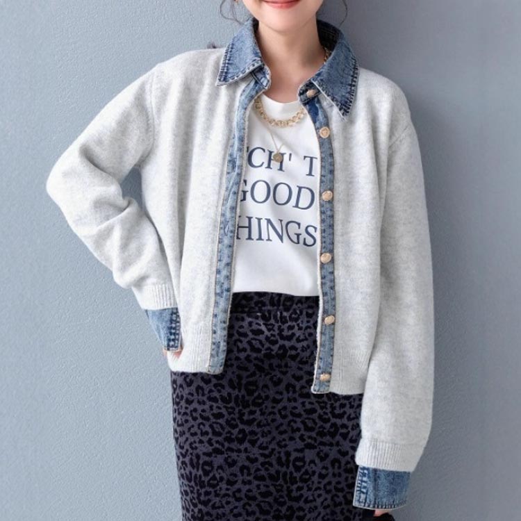 デニムシャツ風レイヤードニットトップス レディースファッション 豊富な品揃え ホワイト ダークグレー コーヒー ネイビー ライトグレー ワインレッド