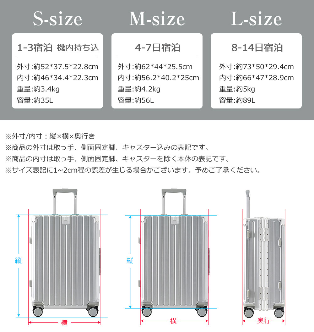 【L 8~14日宿泊】外寸:約73*50*29.4cm 内寸:約66*47*28.9cm 重量:約5kg 容量:約89L