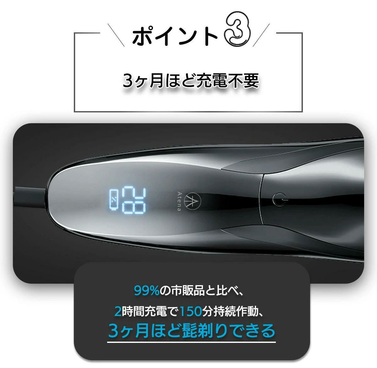 高性能リチウムイオン電池採用で、わずか1.5時間で満充電状態になり、約60日使用できます。お急ぎの時は約3分間の充電で1回分のシェービングが可能です。