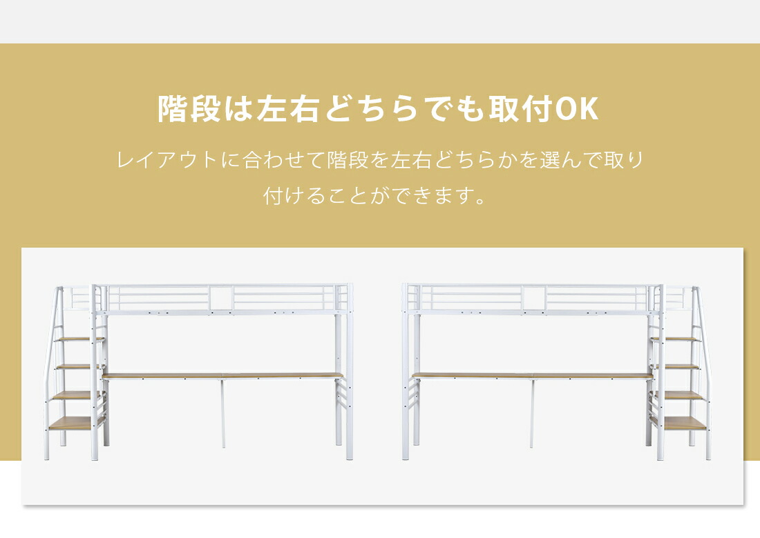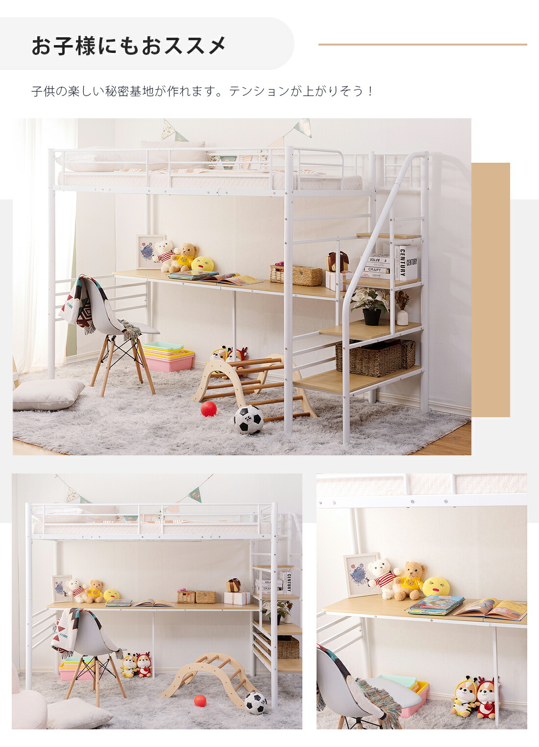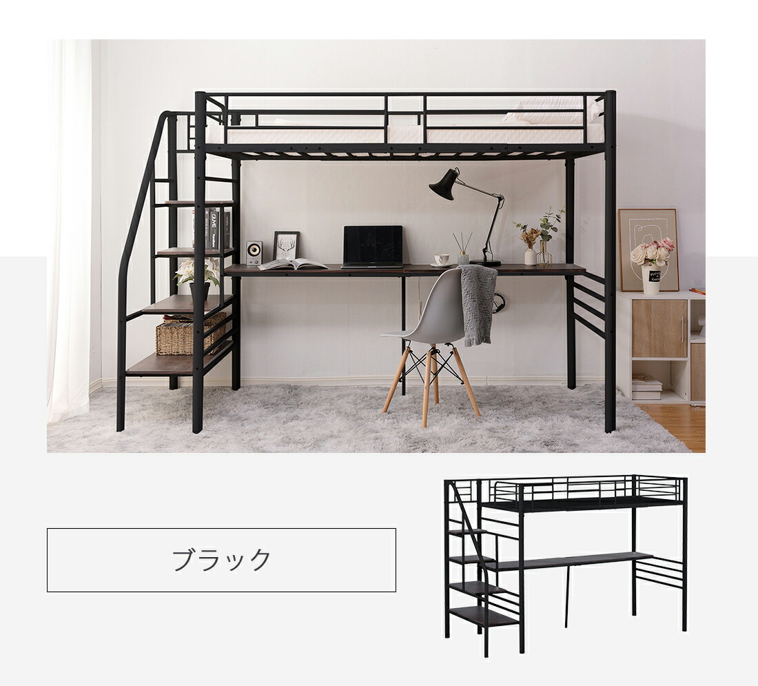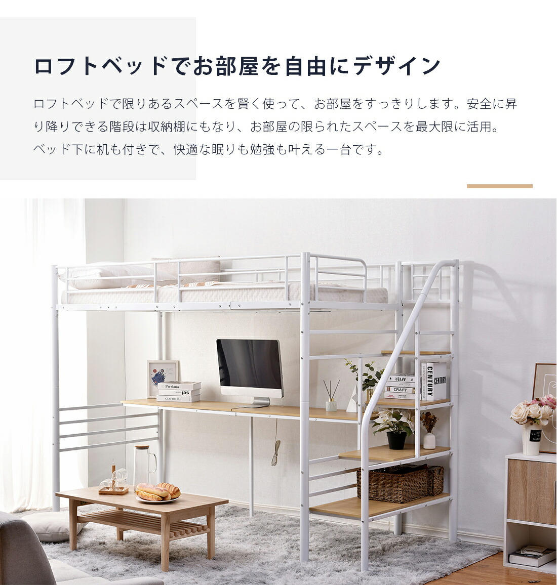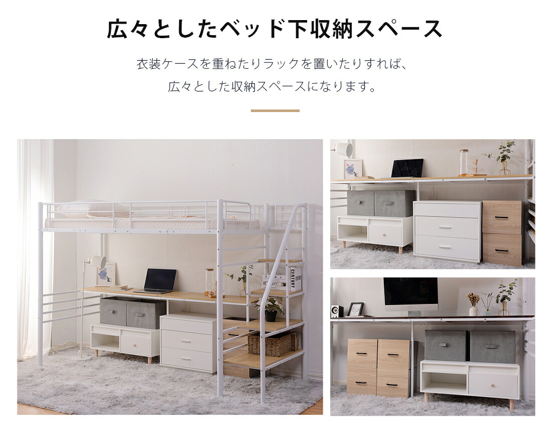 ロフトベッド 段階付き デスク付き 高 ホワイト ブラック