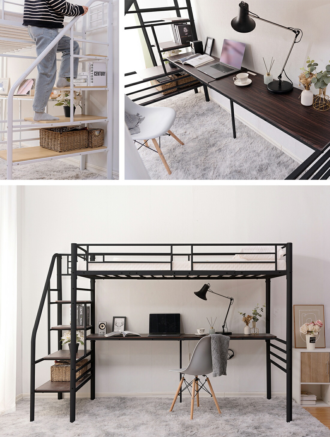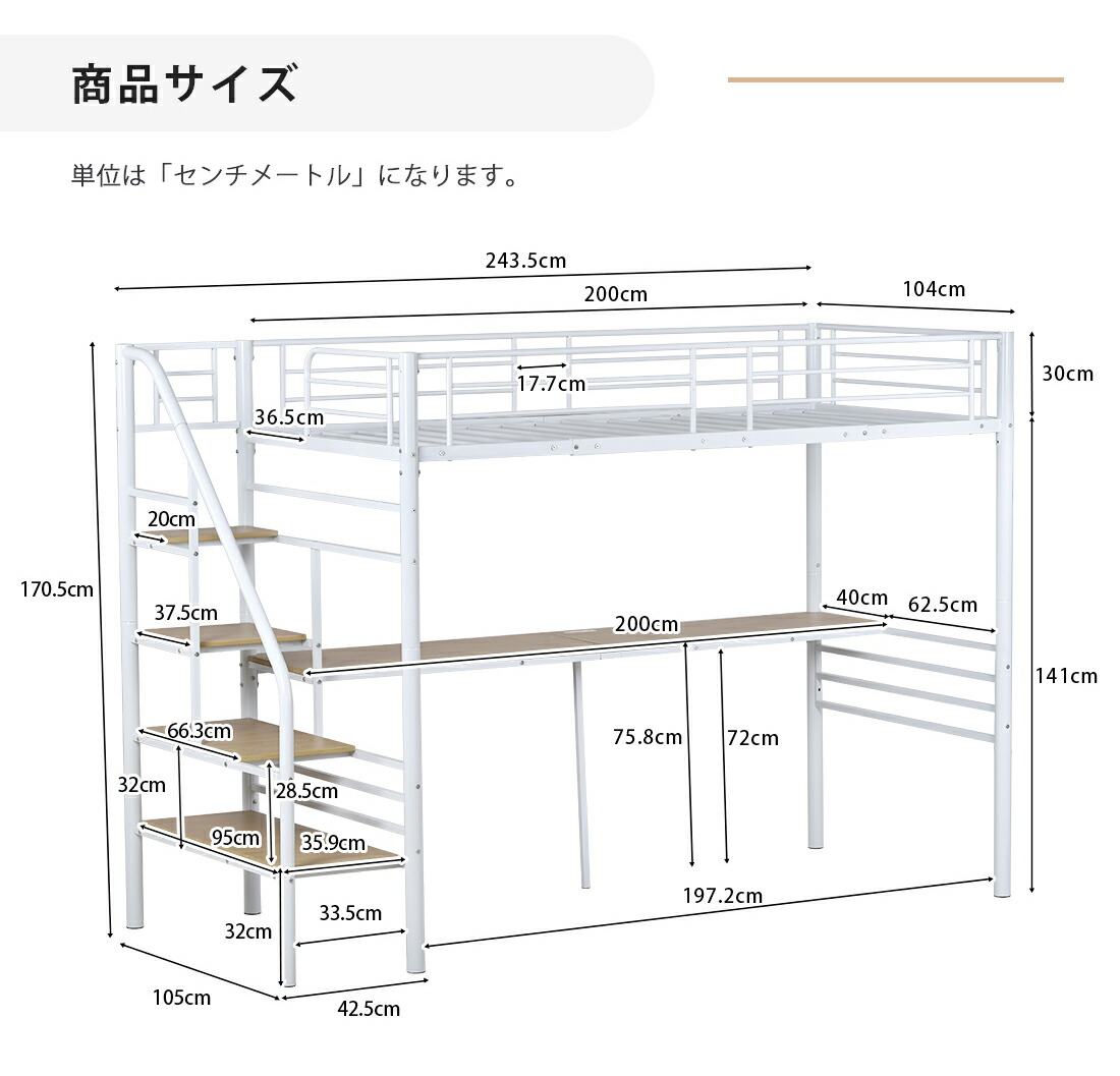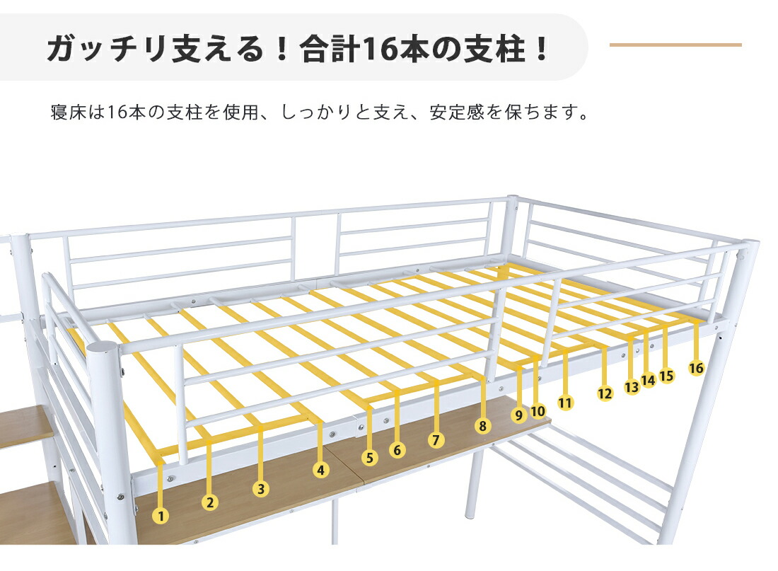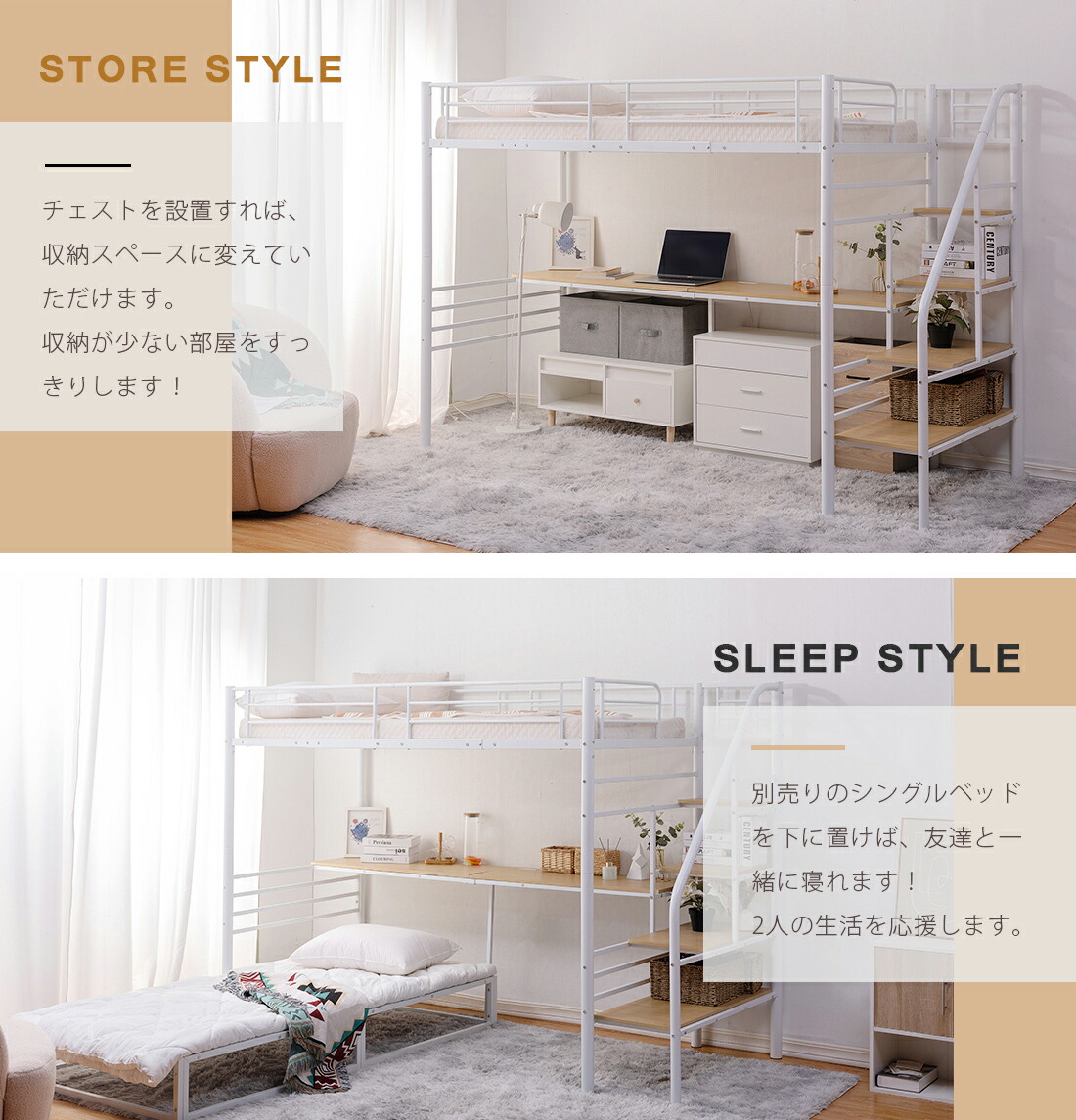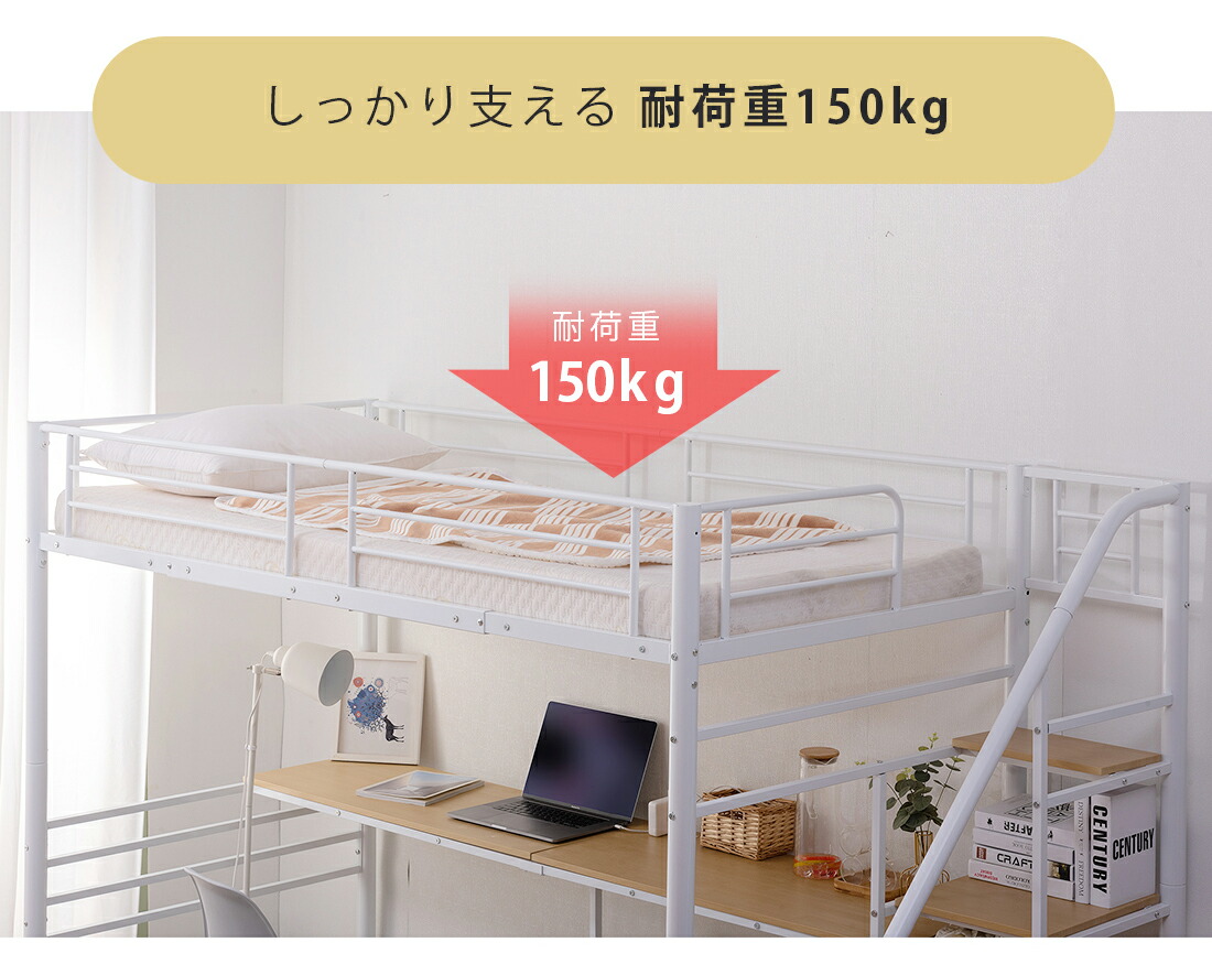 ロフトベッド 段階付き デスク付き 高 ホワイト ブラック