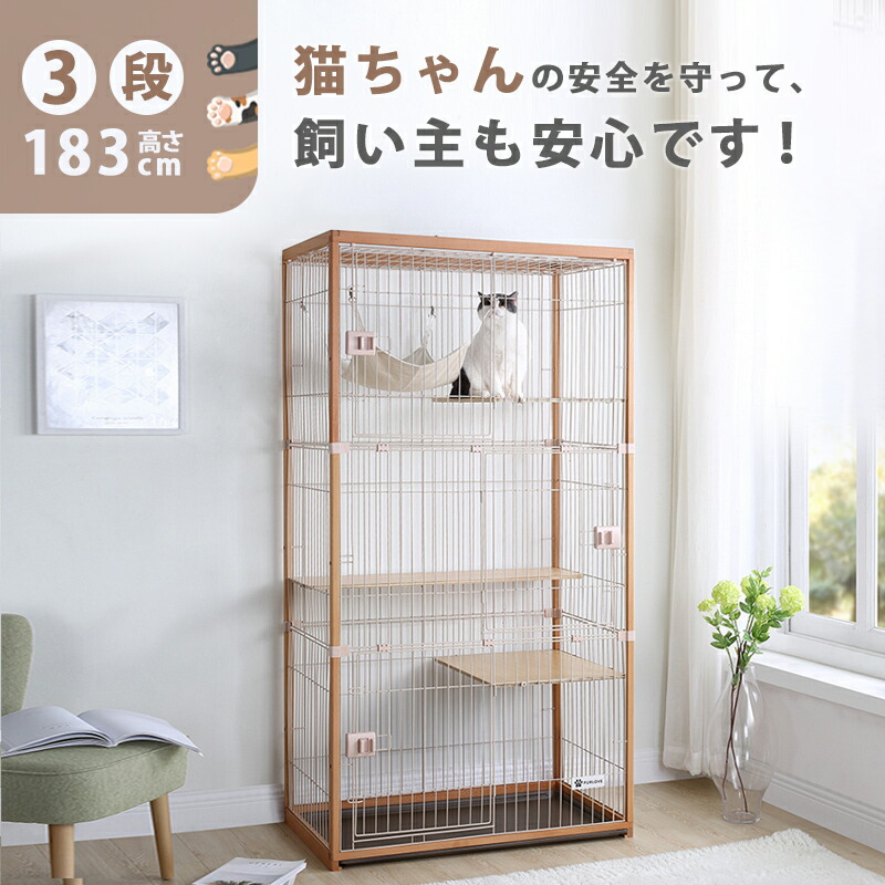 猫 ケージ キャットケージ 3段 木製フレーム ハンモック付 広々 大型 猫ゲージ 高級感 おしゃれ キャットハウス ネコ ハウス 多段 留守番 保護 脱走防止 多頭 スチール ペットケージ 多頭飼い