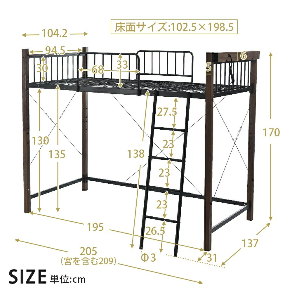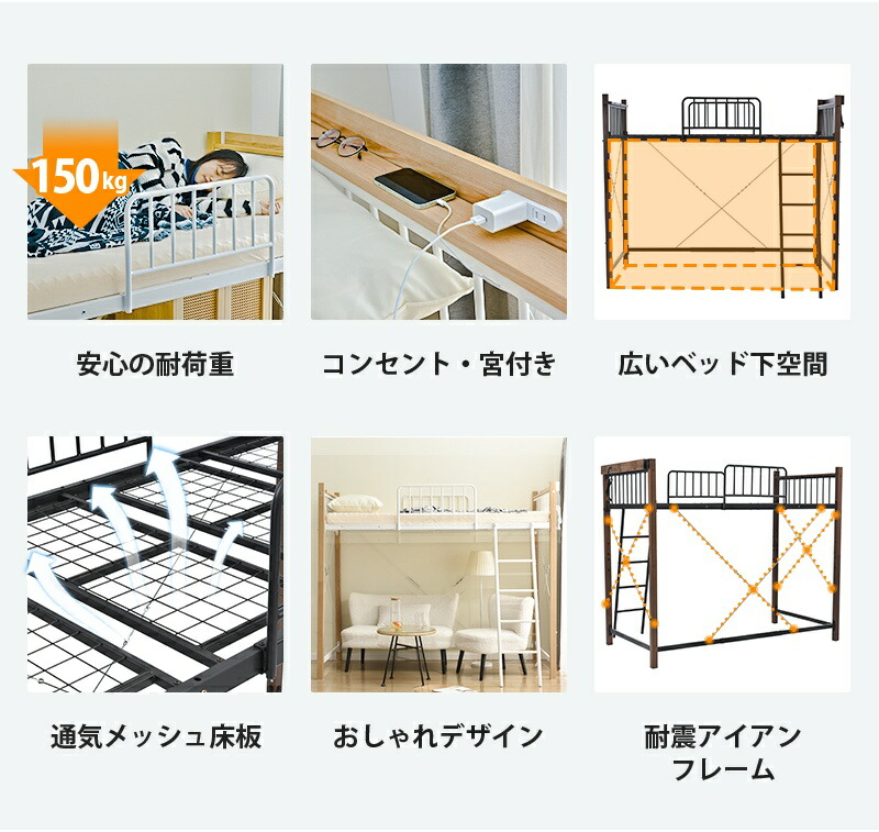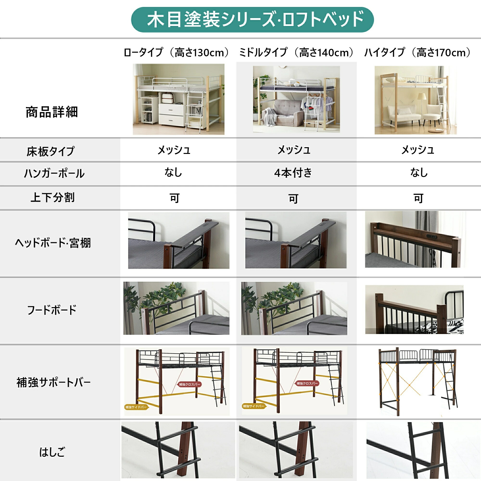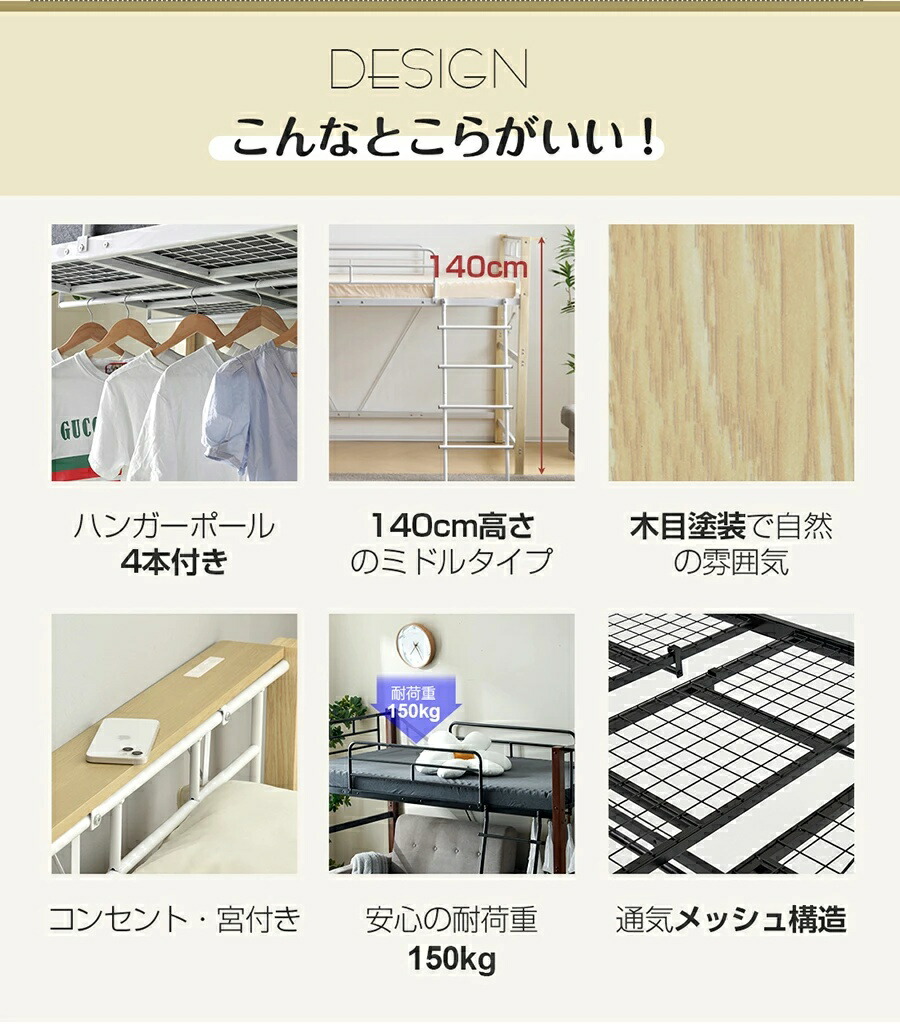 ロフトベッド シングル 高さ3タイプ ロータイプ(高さ130cm) ミドルタイプ(高さ140cm) ブラック ホワイト