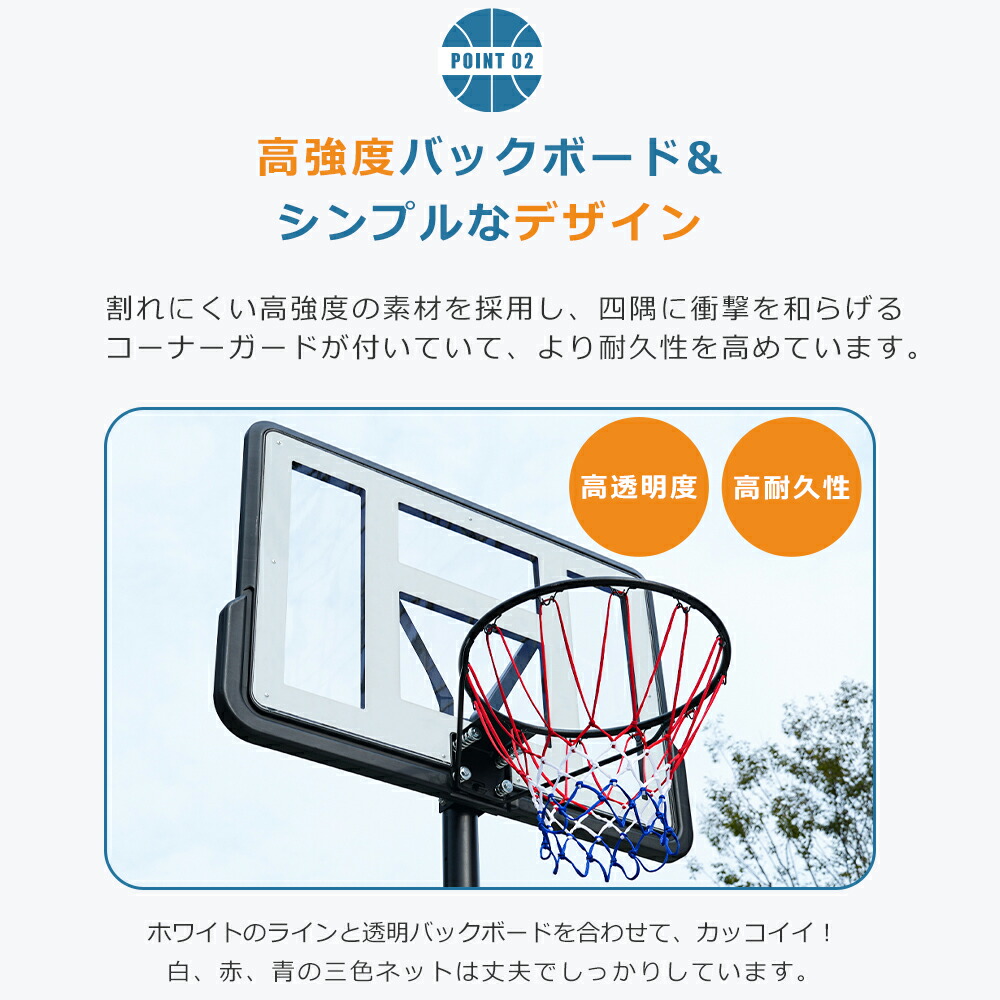 バスケットゴール 公式&ミニバス対応 230-305cm リバウンド付き ハンドルを回すだけの簡単高さ調節 移動可 工具付き ゴールネット バックボード リング 一般用 屋外用 1年保証付き ミニバス