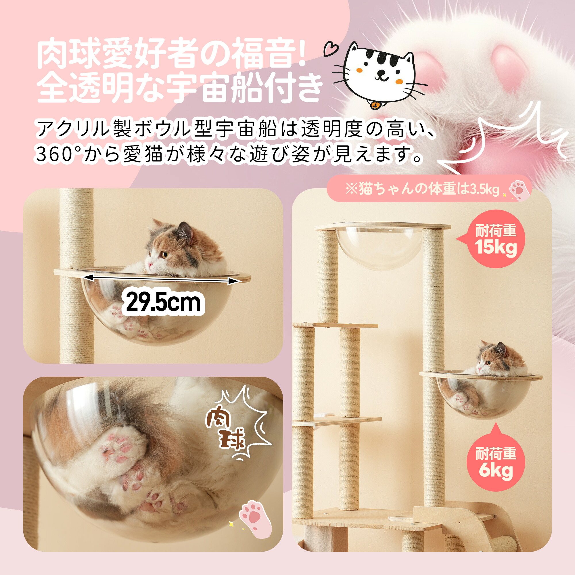 キャットタワー 木製 階段付き 透明宇宙船 隠れ家 大型 据え置き 頑丈 おしゃれ 可愛い麻紐 爪とぎ 猫ベッド 安全安心 ペット用品 大型猫 多頭飼う シニア猫 運 子猫