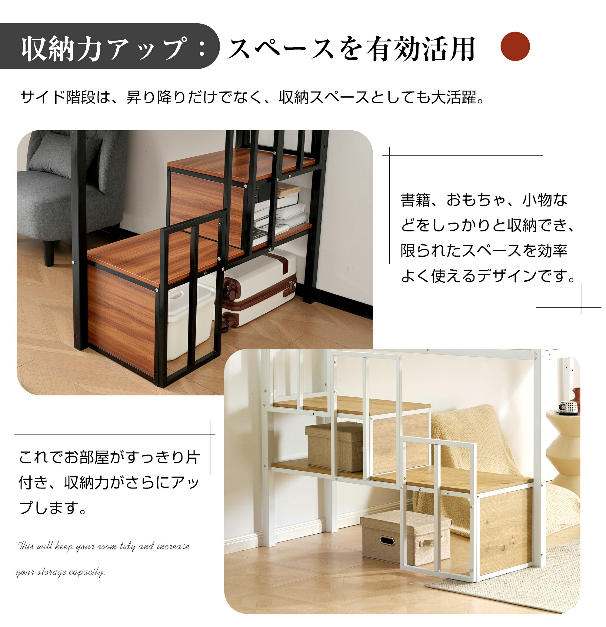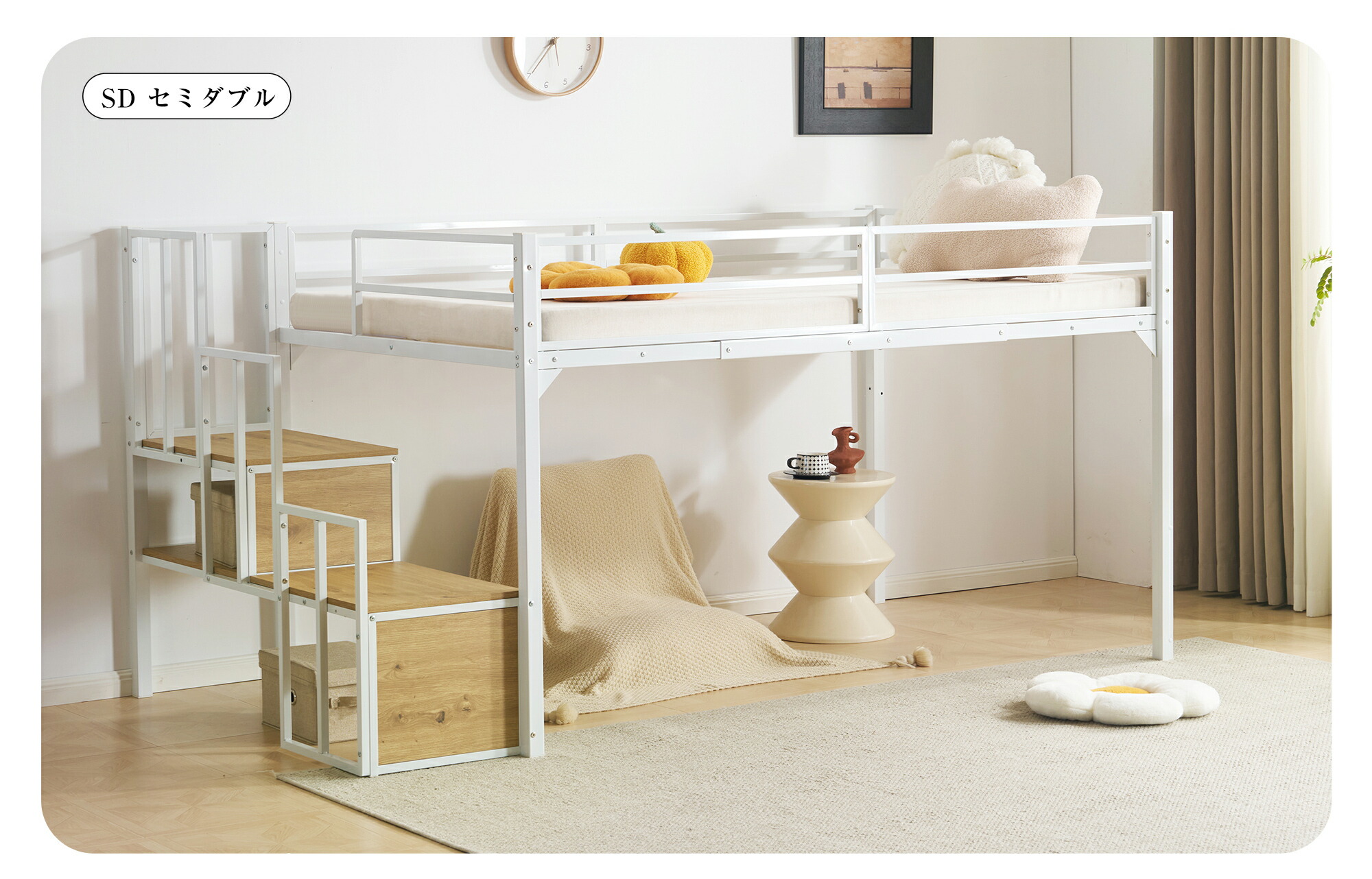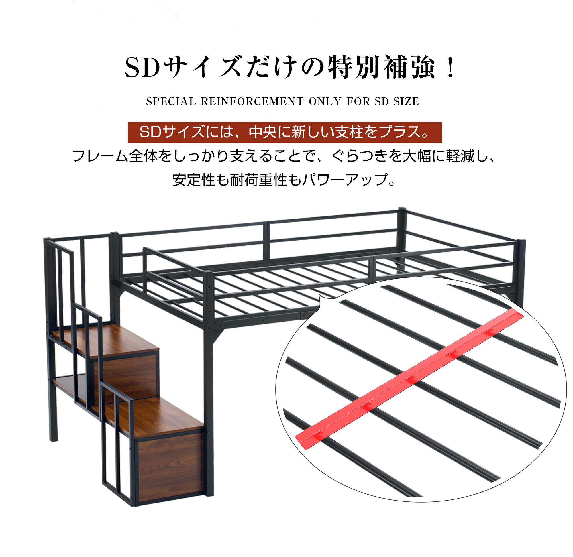 ロフトベッド 階段付き パイプベッド シングル セミダブル ブラック ホワイト