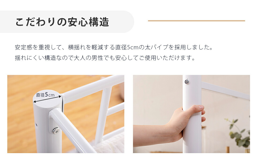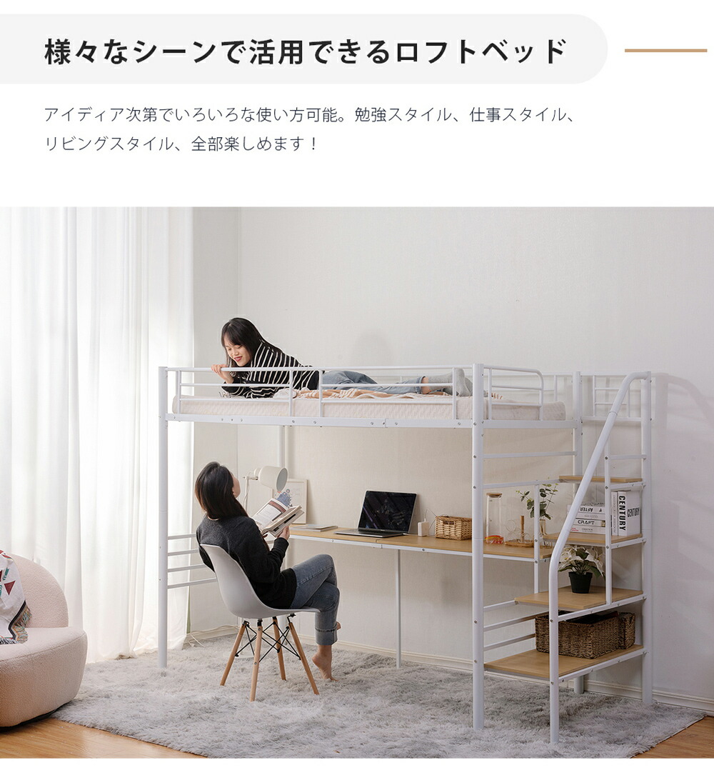 ロフトベッド 階段付き パイプベッド 【ブラック】 ホワイト