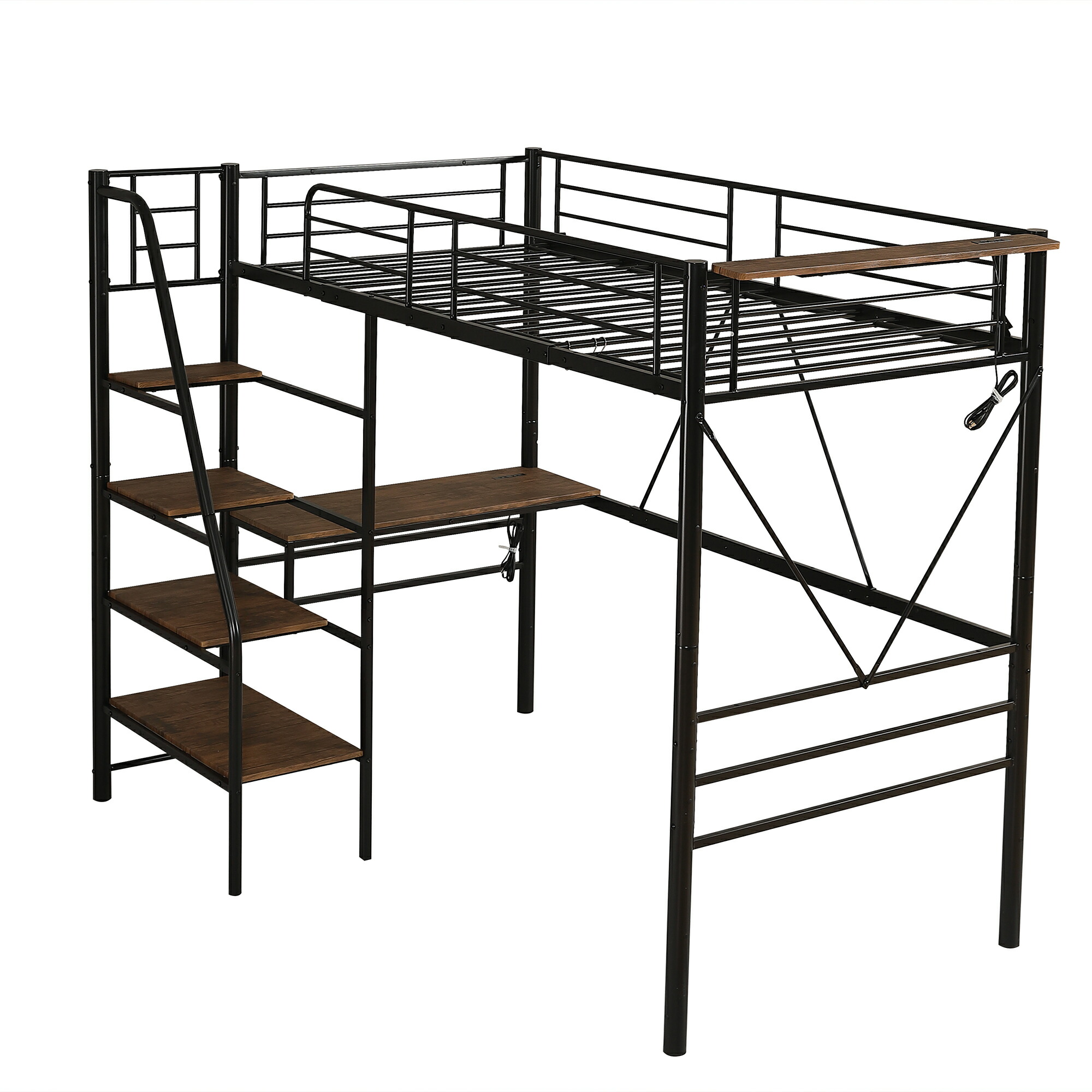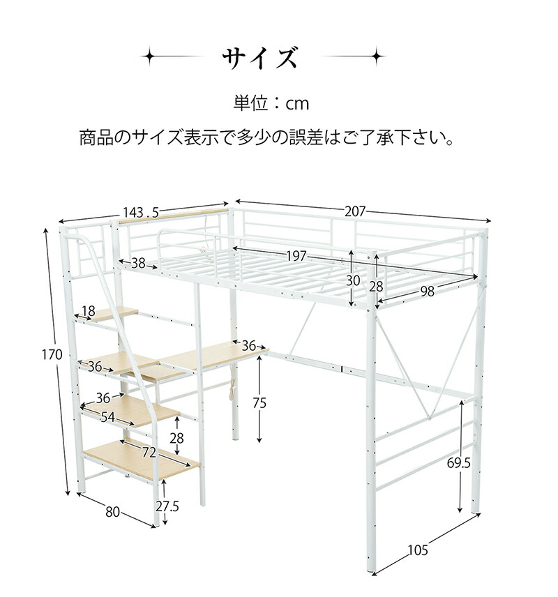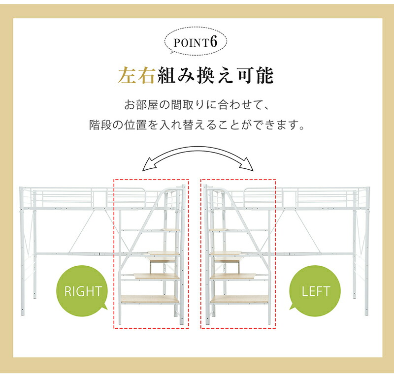 ロフトベッドシングル 階段式 パイプベ ブラック ホワイト