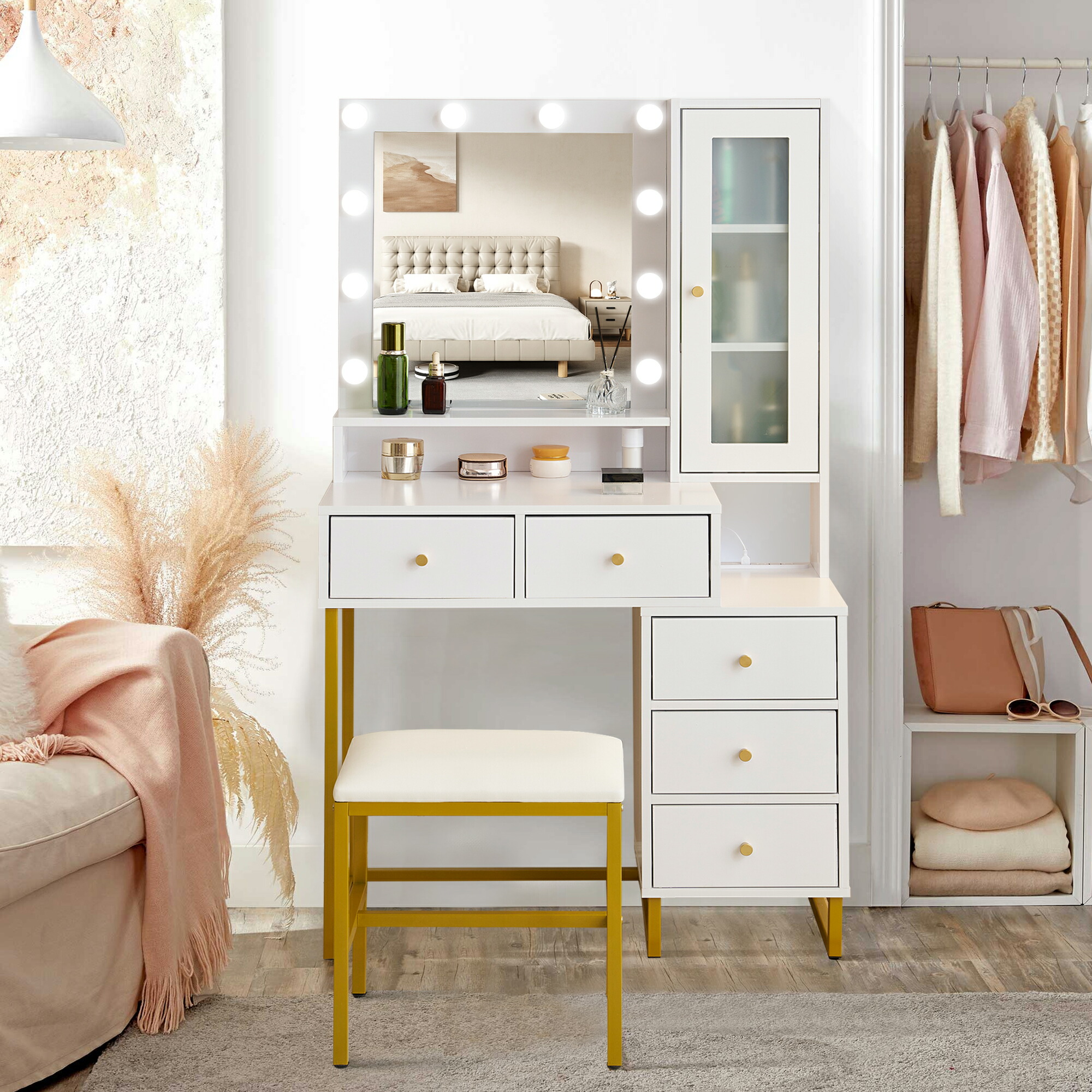 ドレッサー 化粧台 LEDライト付き ドレッサーセット コンセント付き 鏡台収納棚 引き出し付き LEDミラー スツール付き 女優ミラー コンパクト デスク 可愛い メイク台 化粧 収納