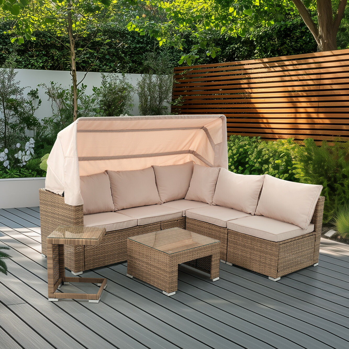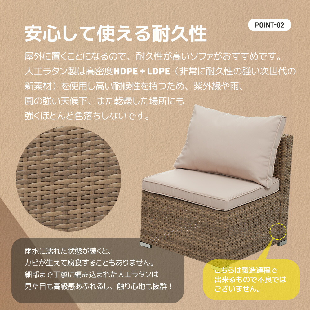 ◆【安心して使える耐久性】 人工ラタン製は高密度HDPE + LDPEを使用し高い耐候性を持つため、紫外線や雨、風の強い天候下、また乾燥した場所にも強くほとんど色落ちしないです。