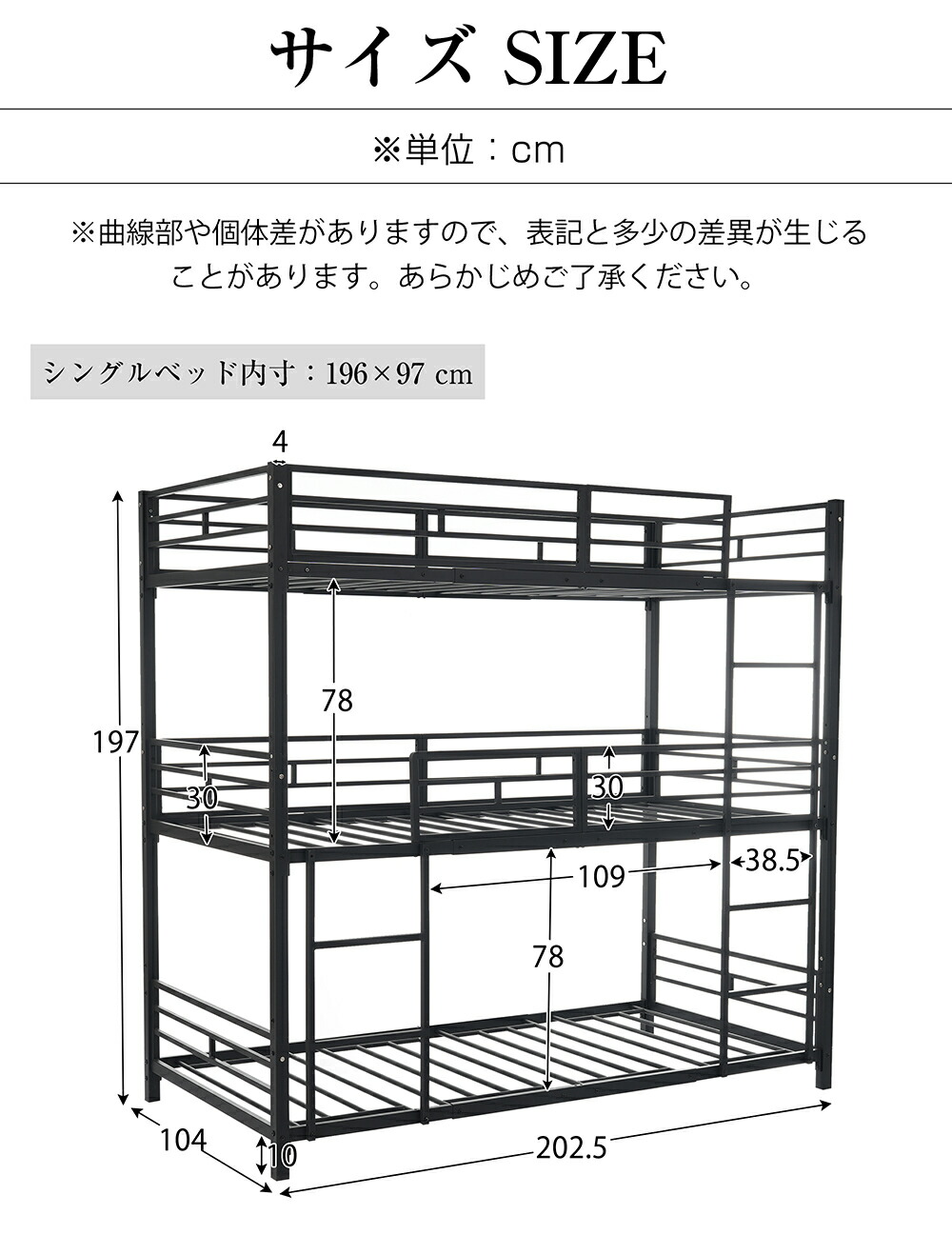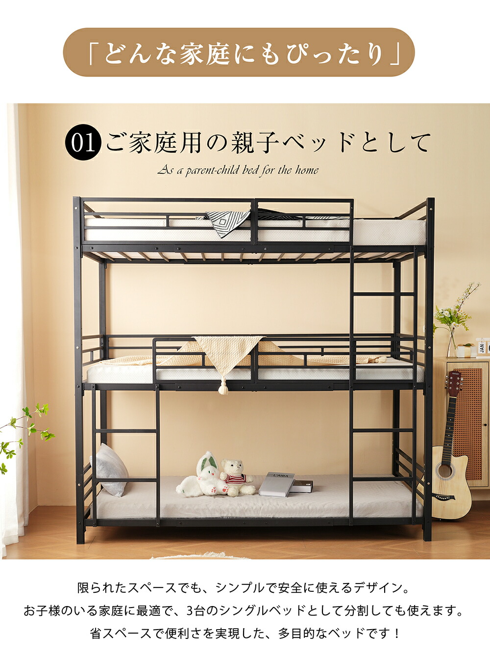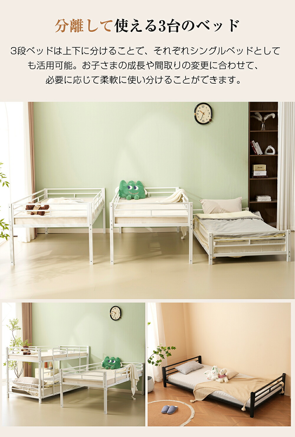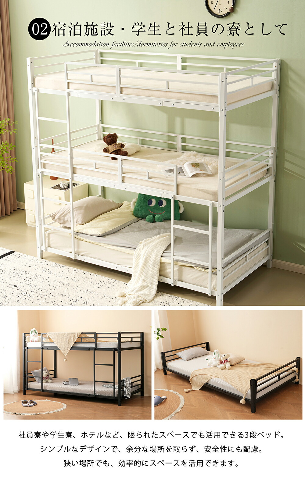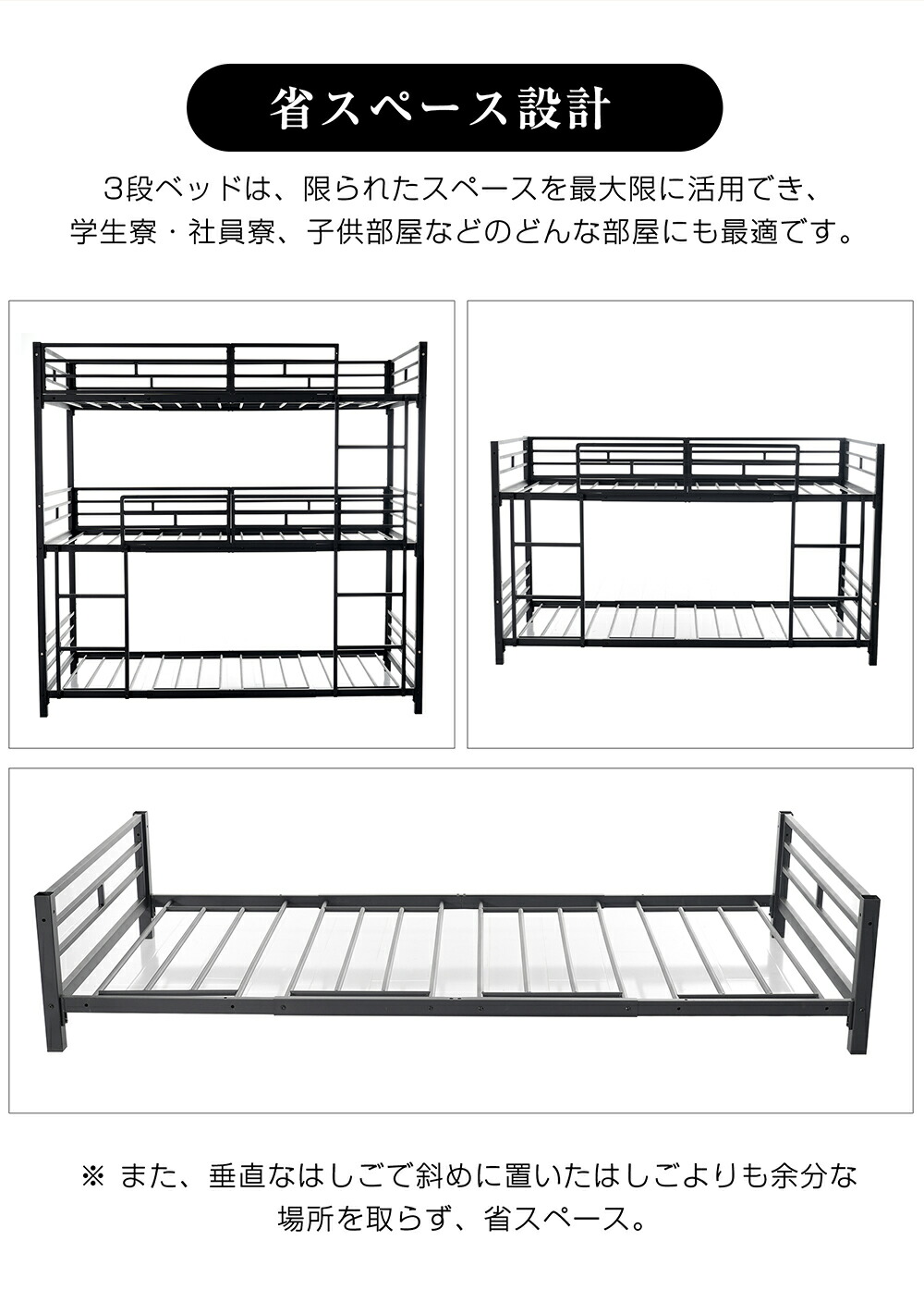 三段ベッド 子供 パイプ 大人用 シン ブラック ホワイト