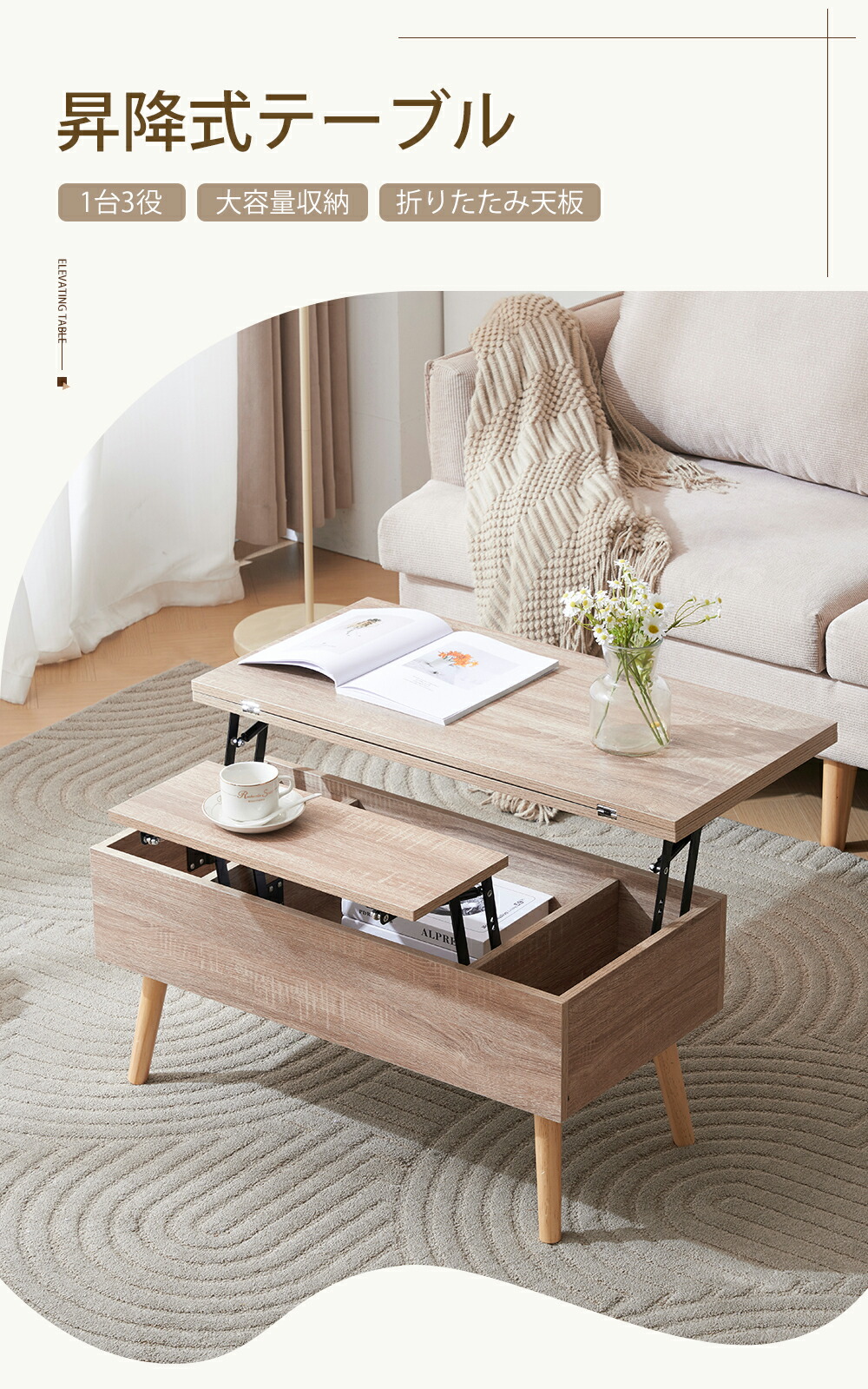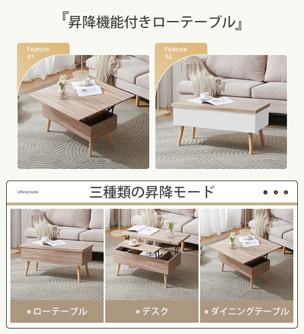 テーブル 油圧昇降式テーブル 昇降テー ナチュラル+ホワイト ナチュラル