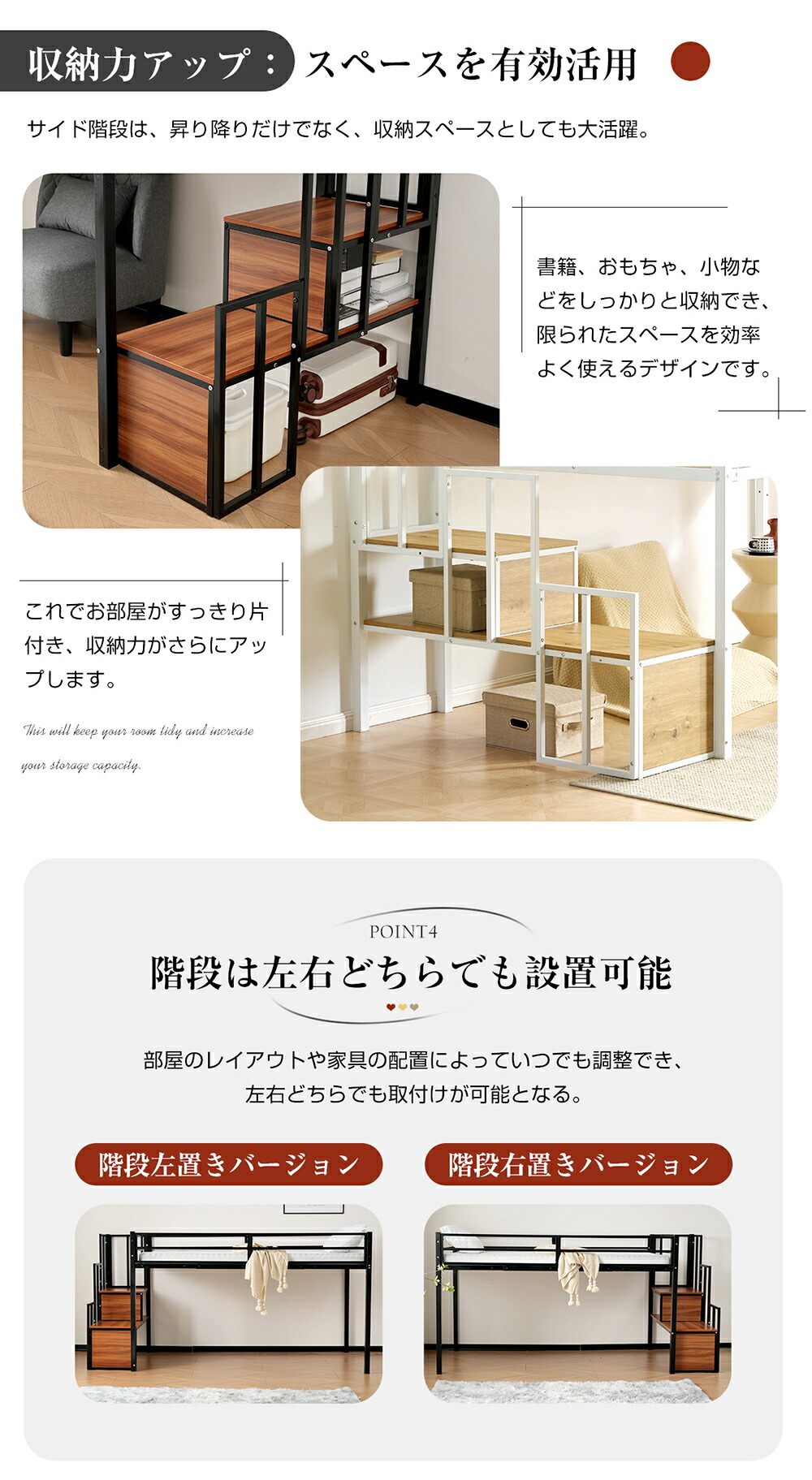ロフトベッド パイプベッド 階段付き シングル セミダブル ブラック ホワイト
