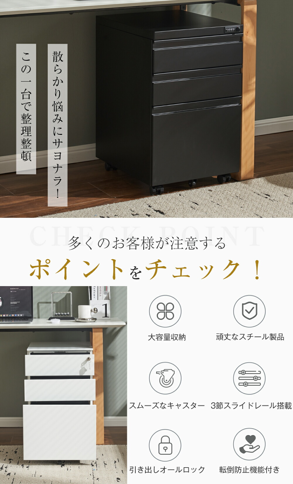 サイドワゴン 大容量 3段 キャスター ホワイト ブラック シリンダー鍵 ダイヤル式