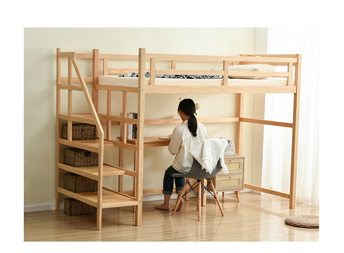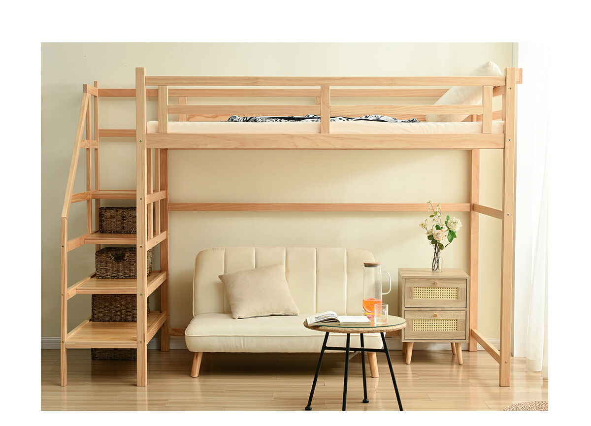 ロフトベッド 階段付き 宮付き 収納棚 ナチュラル ホワイト