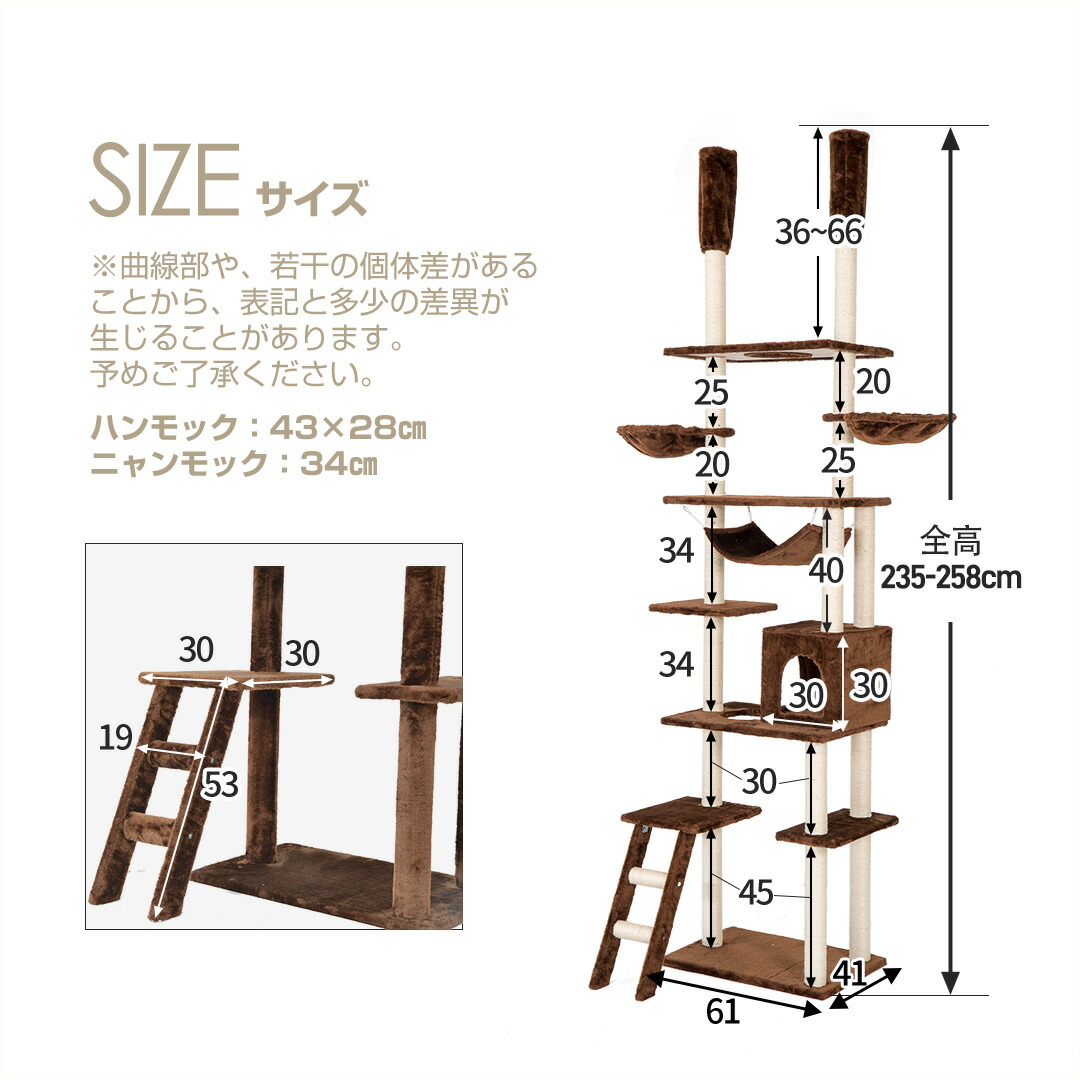 キャットタワー ハンモック付き cattower 突っ張り 全面麻紐 スリム 省スペース おしゃれ全高235-258cm 爪研ぎ 階段 つっぱり 猫タワー 猫ベッド 隠れ家 ペット用品 キャットハウス