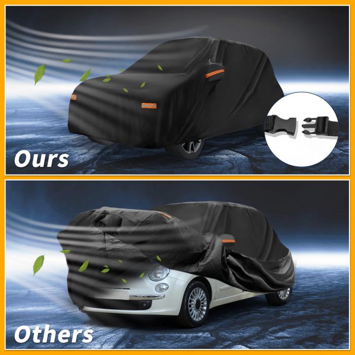 【属性5】[ユニークなデザイン] 当社のカーカバーの内側ライニングは、車両の塗装に優しいように慎重に設計されています。カバーと車の表面の間にバッファーとして機能し、使用中に発生する可能性のある傷や擦り傷を防ぎます。車カバーを使用する際に車両を誤って損傷する心配がなくなります。未使用時には、提供されたポーチに収納することで、カーカバーをきちんと整理し、アクセス可能に保つことができます