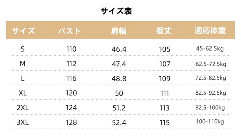 S 着丈110 バスト115 肩幅46.4 適応体重 45-62.5KG