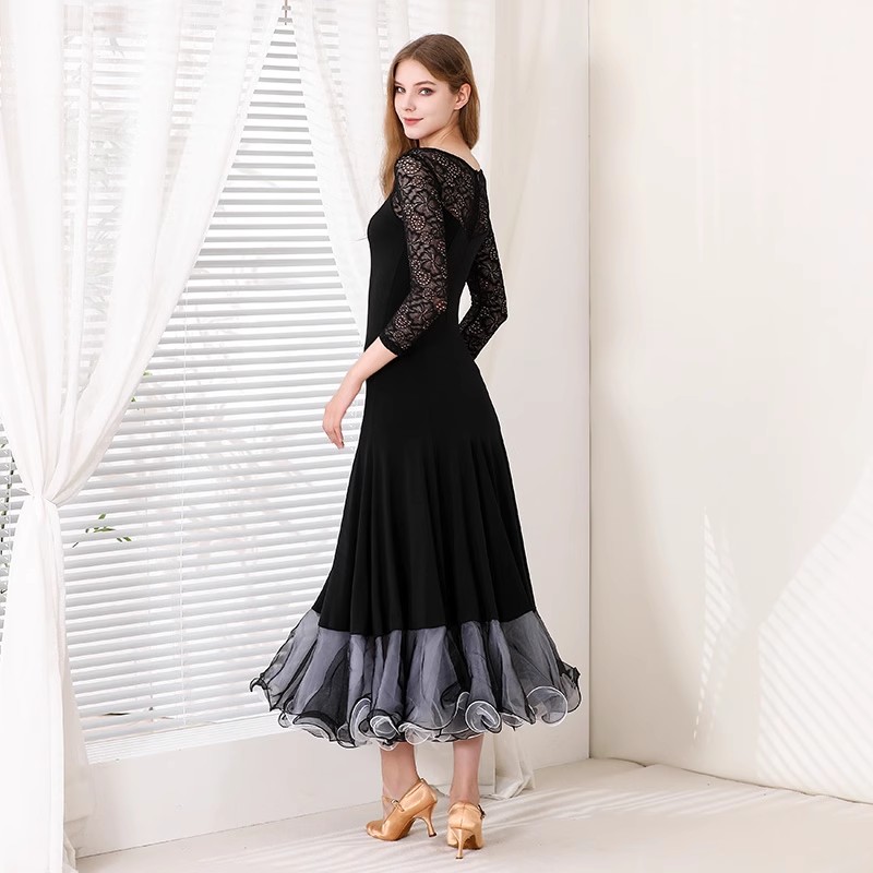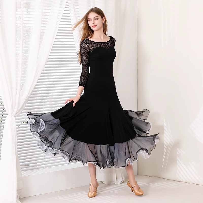 社交ダンスドレス ラテンドレス レース 透け感 セクシー 袖あり 黒 発表会ドレス 大きい裾 社交ダンス衣装 ダンスウェア スタンダードドレス 競技ドレス ワルツ サンバ ラテンダンス 団体ウ ルンバ