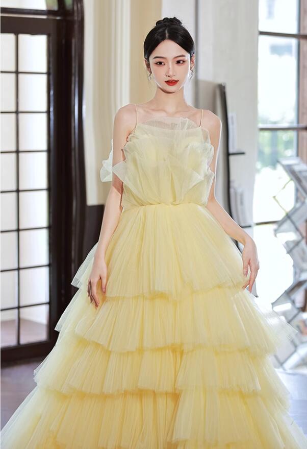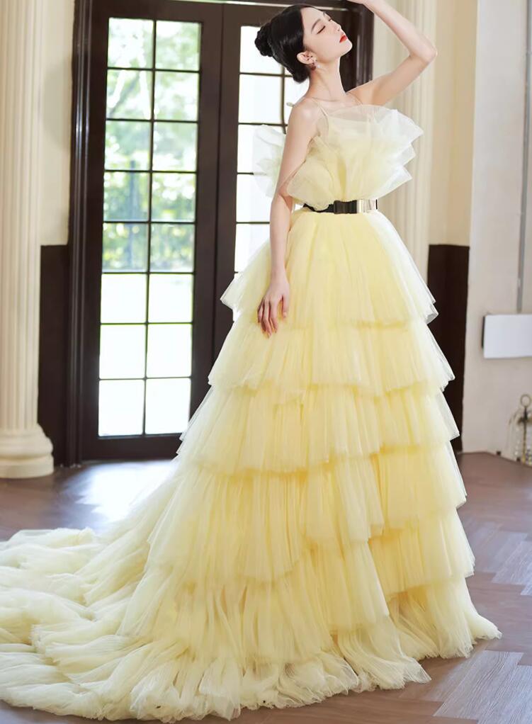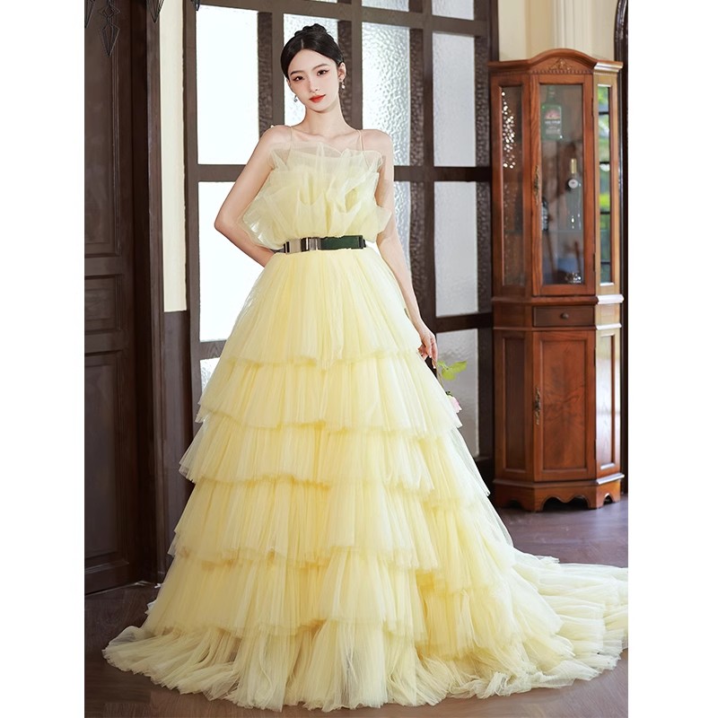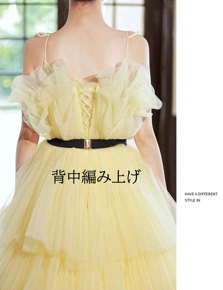 ウェディングドレス 花嫁ドレス カラードレス 黄色 演奏会 お姫様ドレス 高級感 多重チュール 結婚式 前撮り フォトウェディング撮影 ロングドレス 編み上げ パーティードレス 二次会 披露 きれいめ