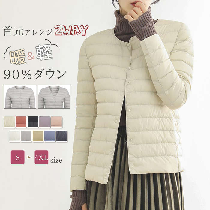 インナーダウン レディース ショート ライトダウン 2way ダウンジャケット 長袖 可愛い ダウン インナー ジャケット ノーカラー ダウンライト 軽量 ラウンドネック 防寒 体型カバー 秋冬 女性