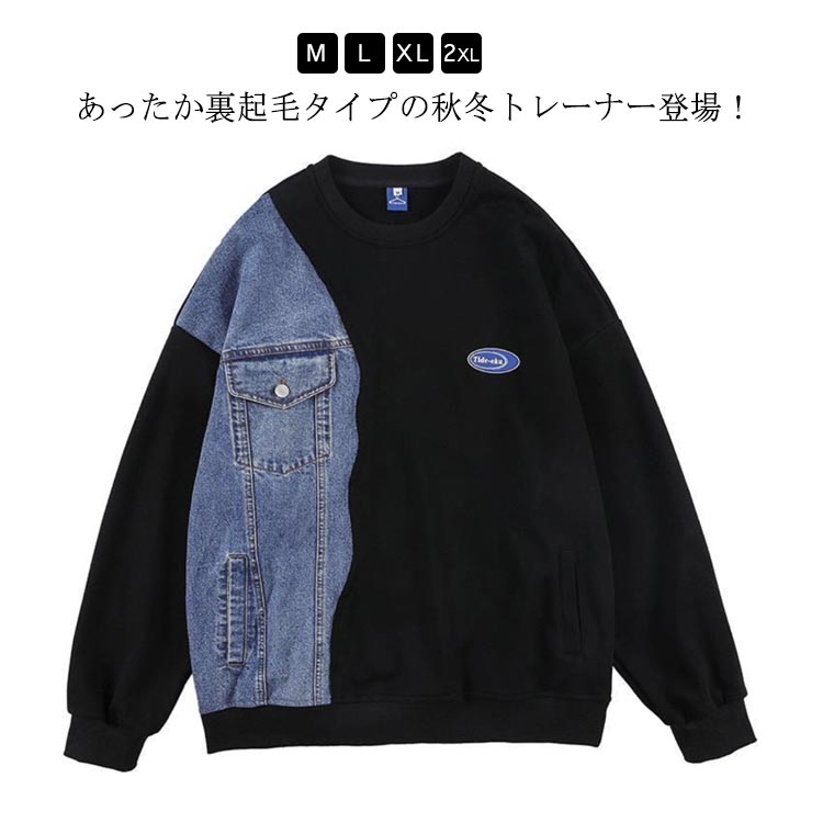 スウェット素材とデニム素材のドッキングデザイン オーバーサイズ長袖ロングワンピ