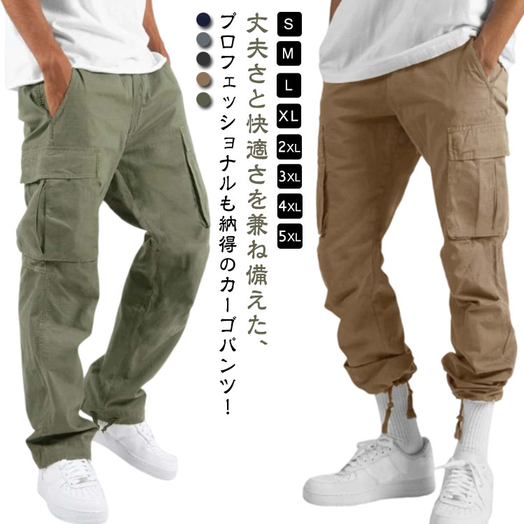 カーゴパンツ メンズ ゆったり 裾絞り 作業着 ズボン パンツ 無地 シンプル ロング ゴムウエスト ワークパンツ 作業服 大きいサイズ 太め ポケット 多い ストレッチカーゴパンツ