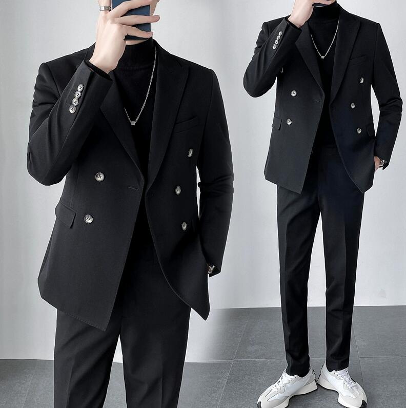 メンズ スーツ 2ピーススーツ ダブルスーツ 黒 スタイリッシュスーツ 2点セット ジャケット+ ズボン セットアップ 上下セット 紳士服 通勤 結婚式 花婿 リクルートスーツ タキシード フ 前撮り