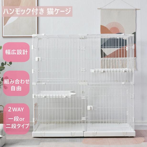 ケージ 猫 キャットケージ 2段 幅広設計 引き出しトレー 自由組み合わせ 多頭飼い キャットハウス ゲージ 大型 キャスター付き ハンモックネコ 留守番 保護 脱走防止 ハウス