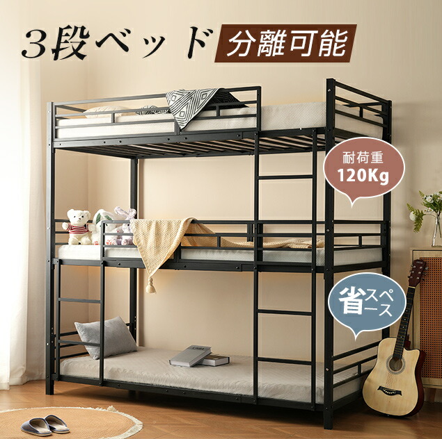 【1年保証/送料無料】三段ベッド 分離可能 シングルベッドと2段ベッドに分離可能 ホワイト ブラック 2色選択