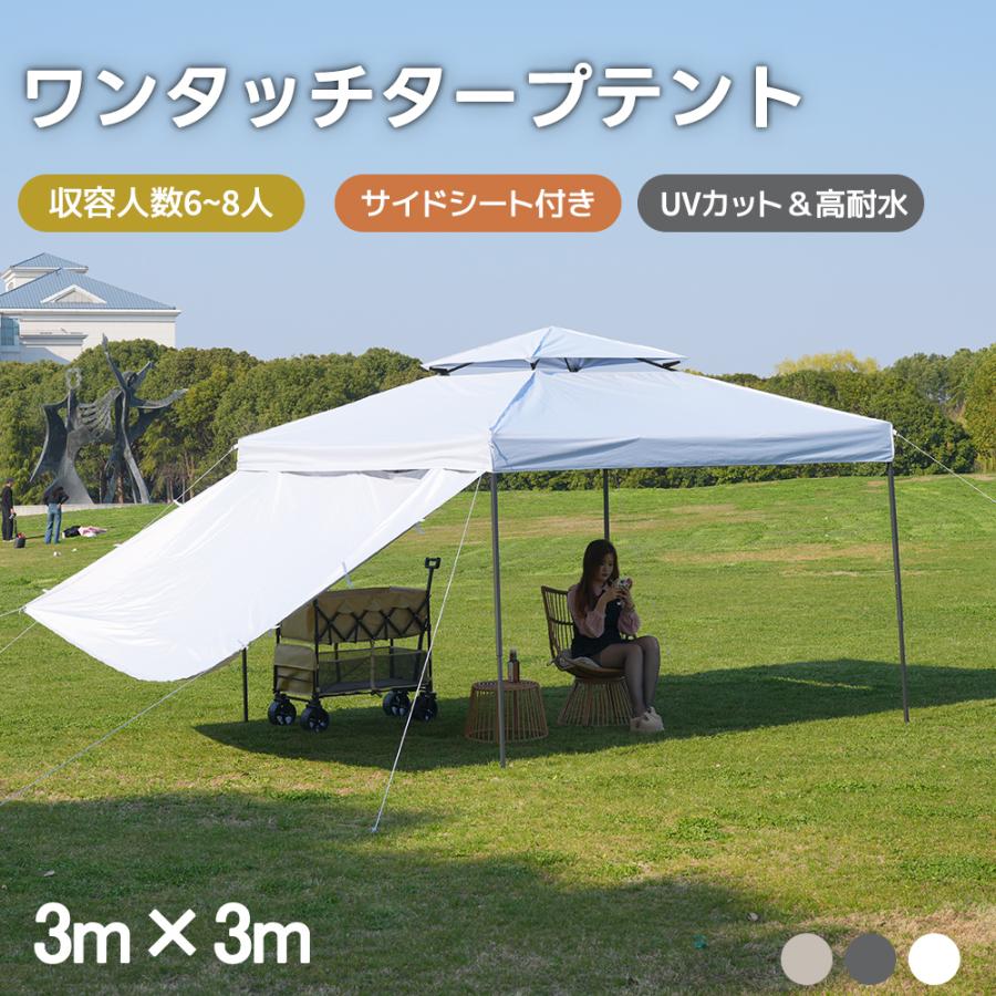 ワンタッチタープテント 3mx3m 6~8人 サイドシート 1枚付き UVカット 高耐水 ホワイト グレー ベージュ 組み立て簡単 高さ三段階調節 テント 専用ケース付き おしゃれ アウトドアタープ