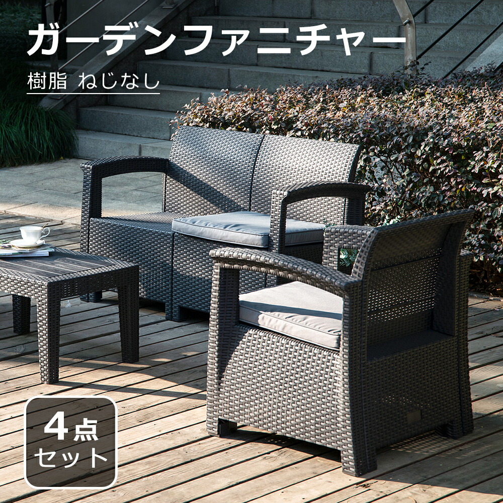ラタン調 ガーデンファニチャー 4点 ガーデンテーブル ガーデンチェアー テーブル 家具 樹脂 ねじなし 楽組 ホテル カフェ ベランダ テラス 高級 ソファ ガーデンソフ 屋外家具