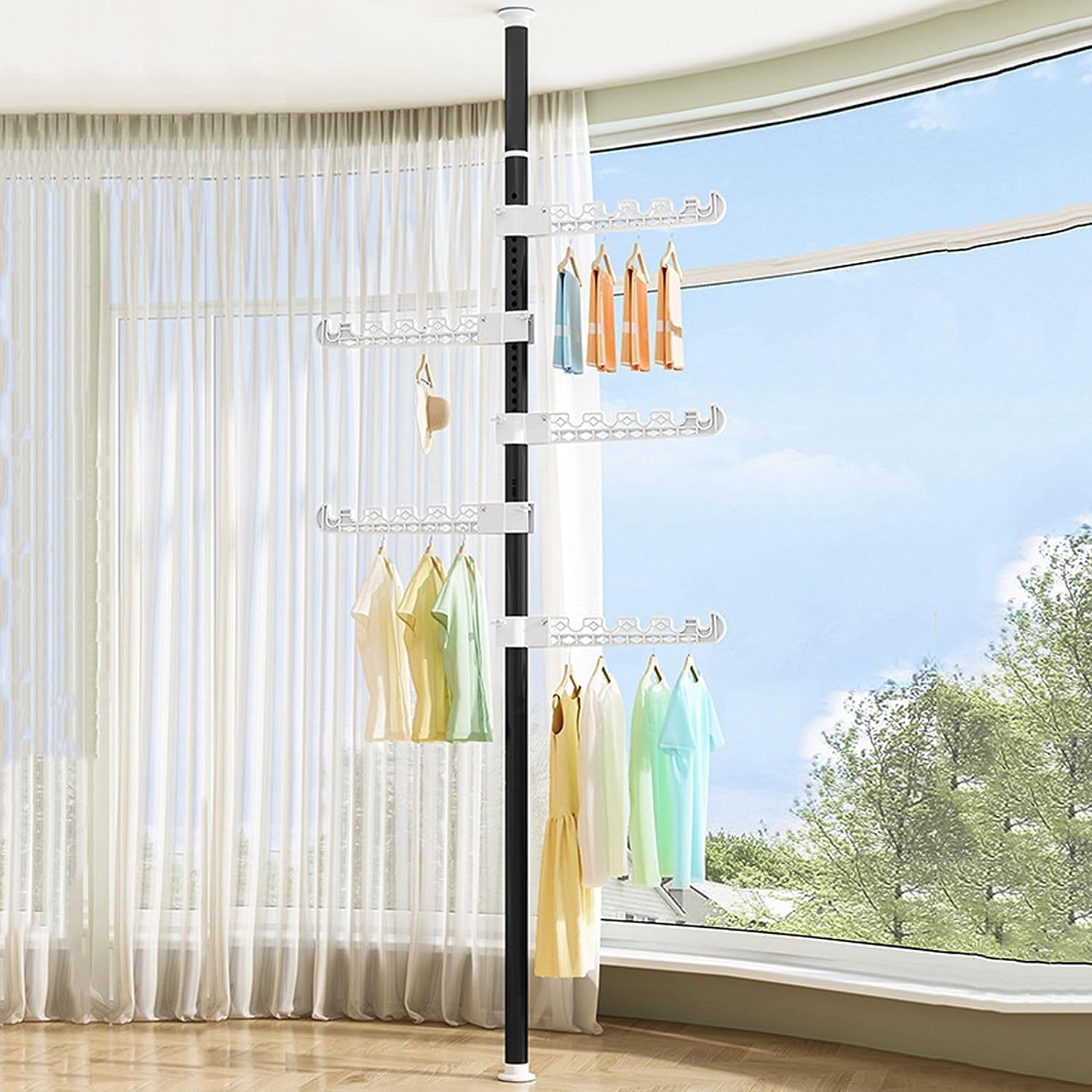 室内物干し 折りたたみ 洋服掛け用衣類ラック 高さ調節可能なDIY床から天井までランドリーラックオーガナイザー ポータブル屋内衣類コート乾燥ラック玄関 廊下用 物干しポール ハンガーアーム 部屋干し